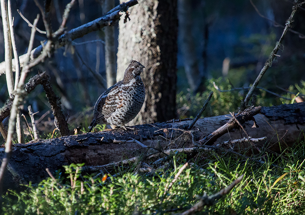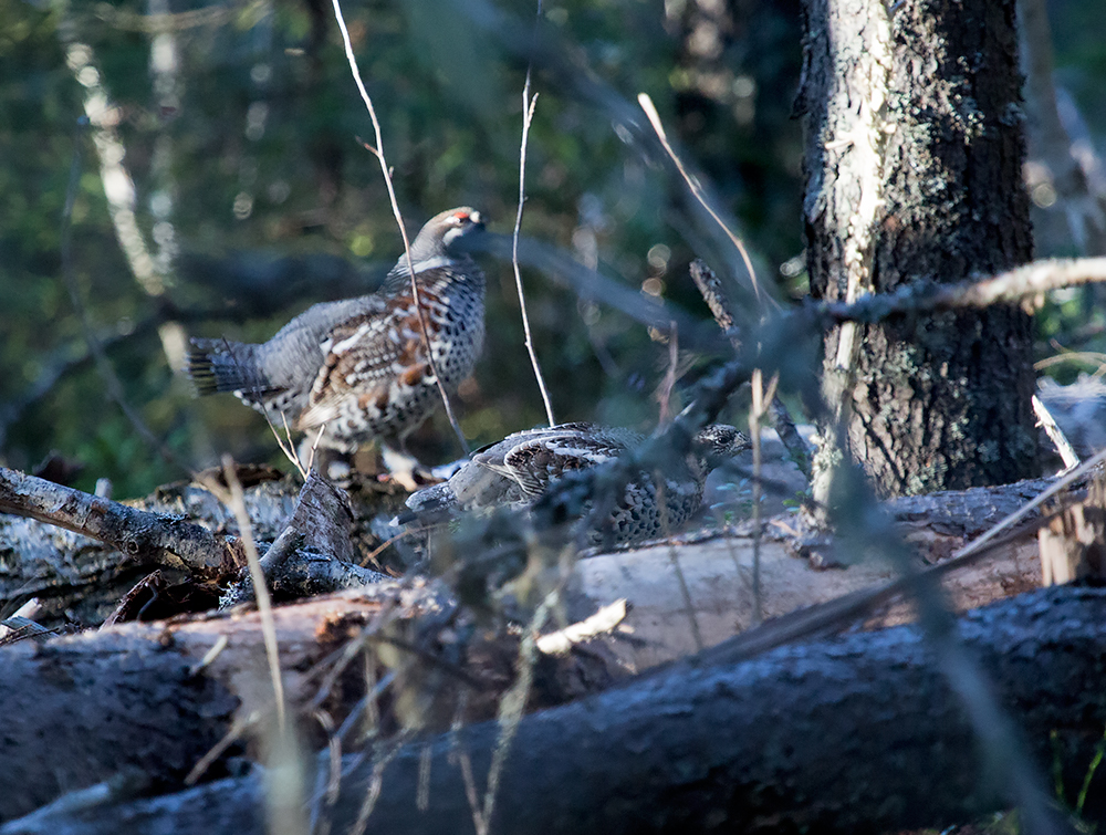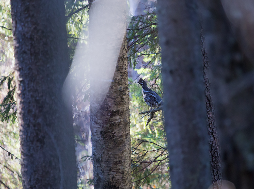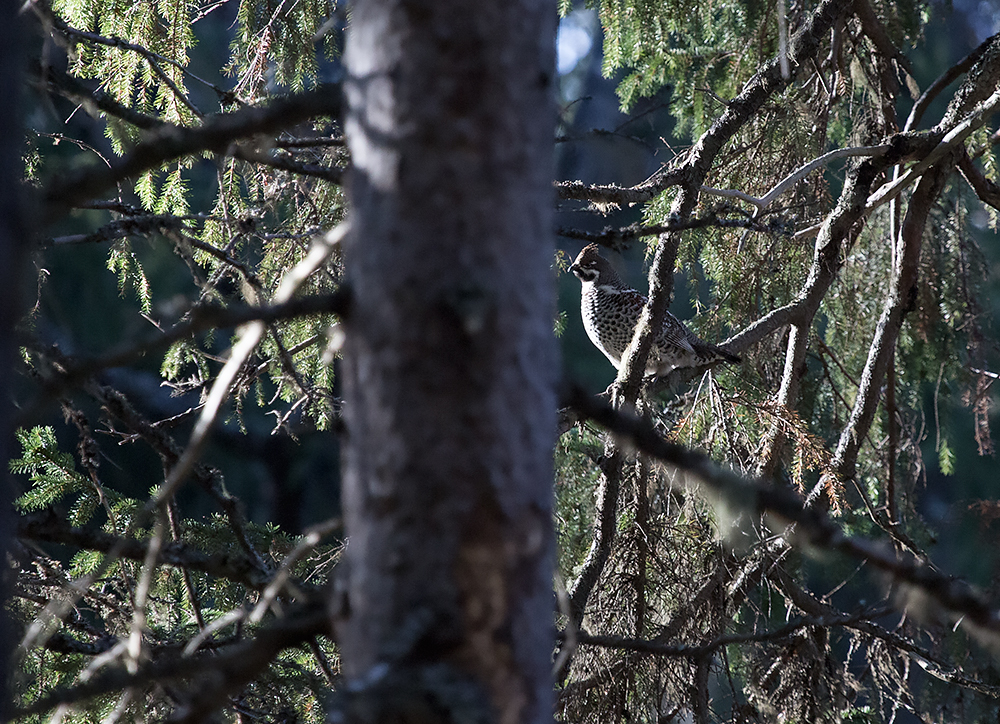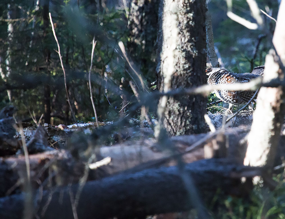 Пока я медленно хожу за рябчиком, которые медленно облетает меня, чтобы изучить - к нам подлетает еще один рябчик. Но сидит где-то высоко в густых ветвях и его не видно. Красота, но когда же будет фото сессия? В момент этих моих мыслей один из рябчиков вылетает на открытое место. Щелкаю камерой.