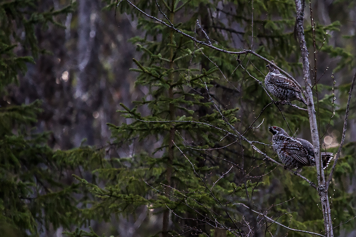 Фотография не очень четкая, но зато показательная. На примере рябчиков. Это классическое положение для боровой дичи при изучении окрестностей и высматривании опасностей. Самочка сидит выше самца. Обычно именно она и дает сигнал "бежать", если рядом есть самец. А вот если самца рядом нет, то она может быть очень наивной - и подпустить опасность гораздо ближе, чем надо. Вот такая социальная забота - боровые девчата оберегают парней, а себя жалеют меньше.
