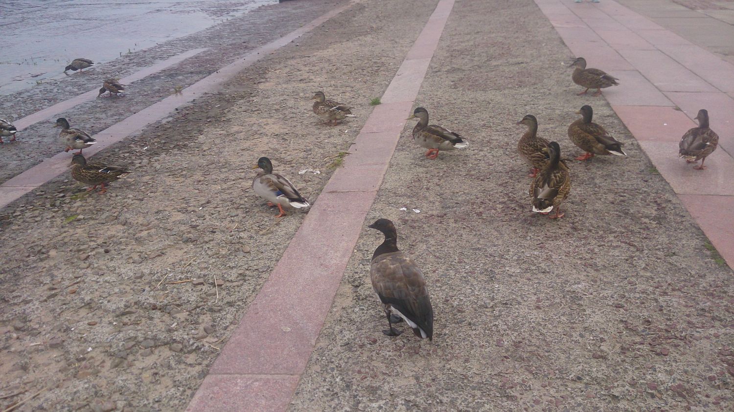 Молодая черная казарка органично встроилась в утиную стаю.