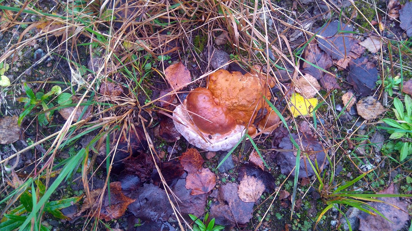 На походе к автомобилю, метров за 200, чуть не наступил на что-то. Оказалось - природа умеет шутить. Очень яркий гриб-трутовик :)