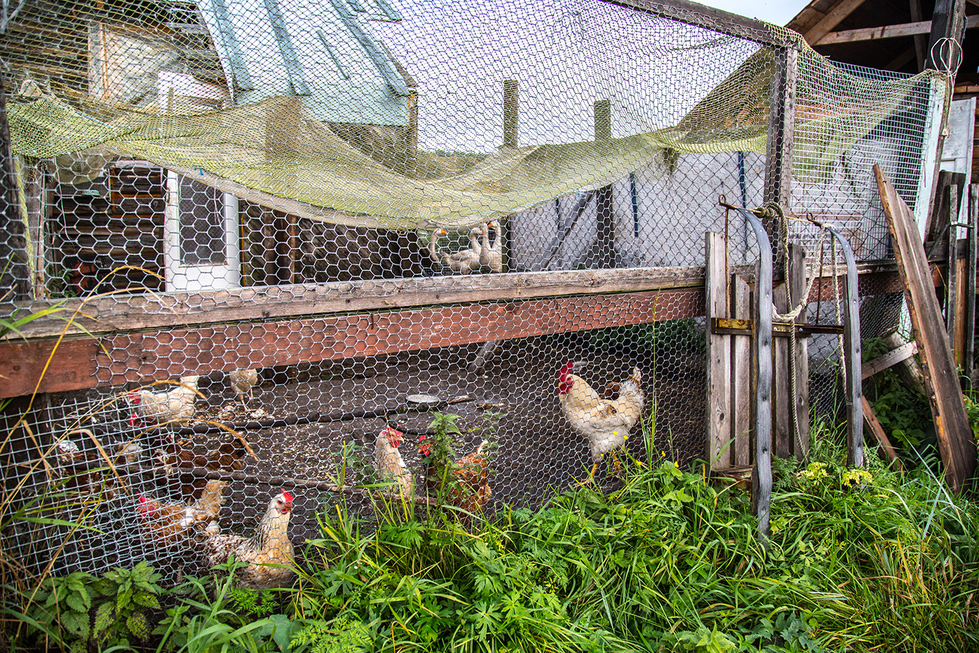 Курицы и петухи по-поморски смелые. Но укрыты сеткой - так как хищники - скопа и ястребы - всегда летают рядом и при случае всегда готовы курятинкой закусить.