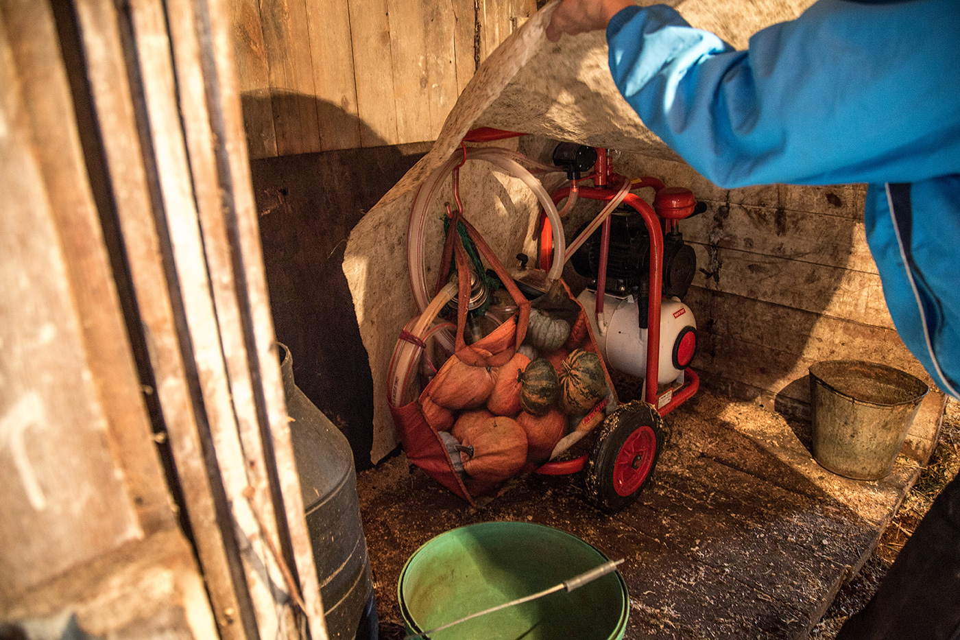 Рядом с хлевом в сарае - ценность хозяйства - доильный аппарат.