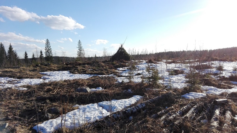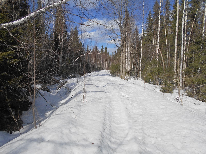 Лесная дорога к от снега отошла не вся. Остов шалашки за зиму ветрами- снегами не развалило.