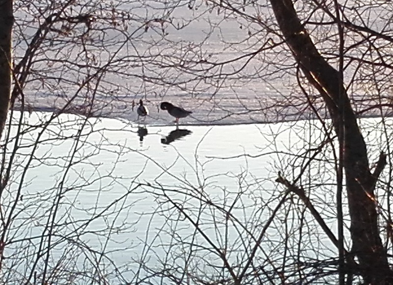 Тетерка ходила по дороге и взлетела на дерево, кода машина уже метров на пять приблизилась. Немного попозировала на ветке. Пара уток чистила перышки у закраины промоины в десяти метрах от дороги