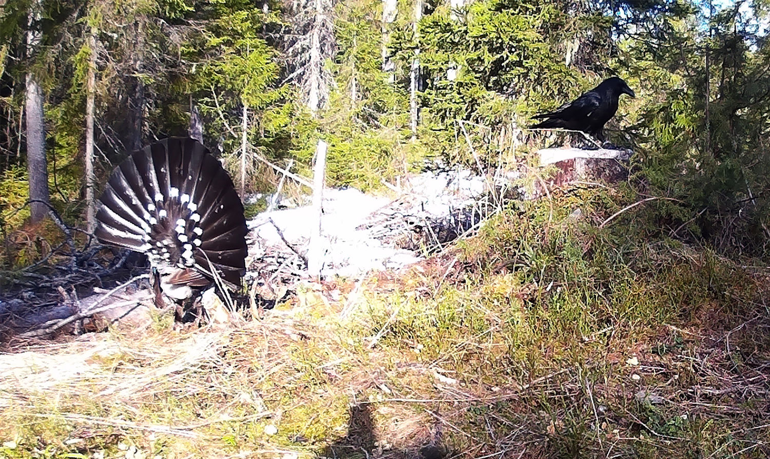 Глухарь и ворон на токовище.