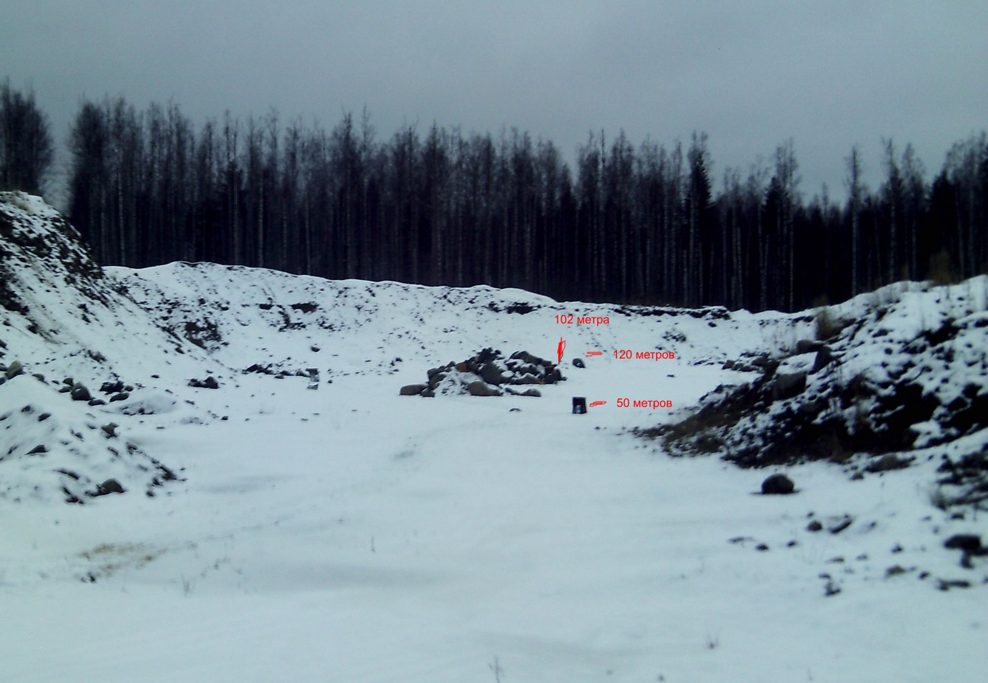 Двадцать минут пути от города. Да-а-а, а в лесу-то снег есть. Немного, можно в сапогах ходить, но есть. Тяжёлый, мокрый. Прибыли с товарищем на место, убедились в отсутствии посторонних, так сказать - соблюли требования безопасности. Ну а как иначе7 Расставили мишени. Исходили из собственных ощущений - как стрелять удобнее. После полученные расстояния промерили лазерным дальномером. Получилось 120, 102 метра и 67 метров. Ну, 67 метров ни к селу, ни к городу. Пришлось подвинуть поближе, до 50-ти метров.