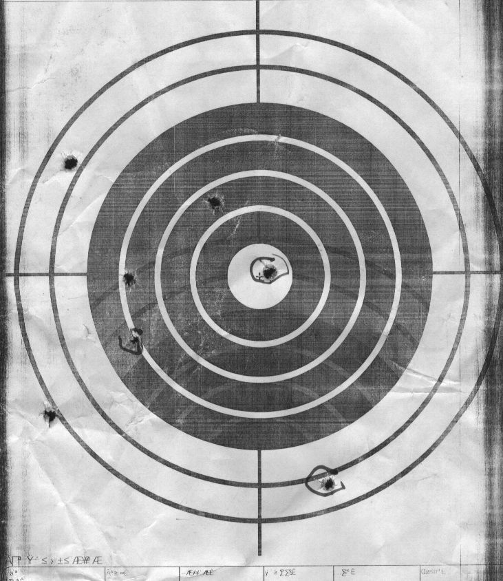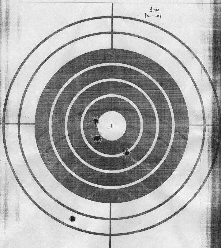 Однако, кучность порадовала. А, была - не была, крутим прицел под эту партию! После небольшой корректировки по вертикали было сделано еще несколько серий. На этой мишени 1-я серия 3 патрона (обведены). Затем 4 выстрела: