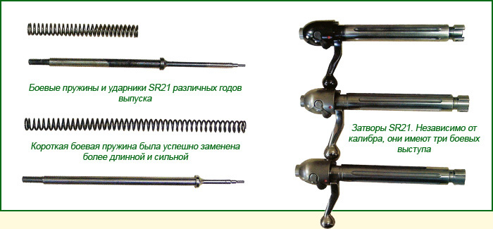 Следует упомянуть, что винтовки SR21 первых партий изготовления (примерно до 2003 г.) имели короткую боевую пружину. Позднее для профилактики от возможных осечек она была заменена на более длинную, что потребовало внести изменения в размеры посадочного места под неё на ударнике. Новые и старые пары «пружина-ударник» взаимозаменяемы на всех затворах, но подчеркну - только в паре: не удаётся поставить на «старый» ударник «новую» пружину, и наоборот.