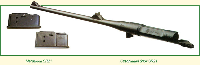 Модель SR21, наоборот, весьма часто приобретается в комплекте с одним или двумя дополнительными сменными ствольными блоками. Наиболее часто востребованы следующие комбинации: .223Rem.+9,3x62; .243Rem.+9,3x62; .223Rem.+.39-06Spr.+9,3x62; .243Rem.+ .30-06Spr.+ 9,3x62.