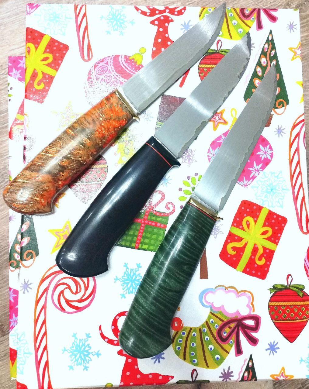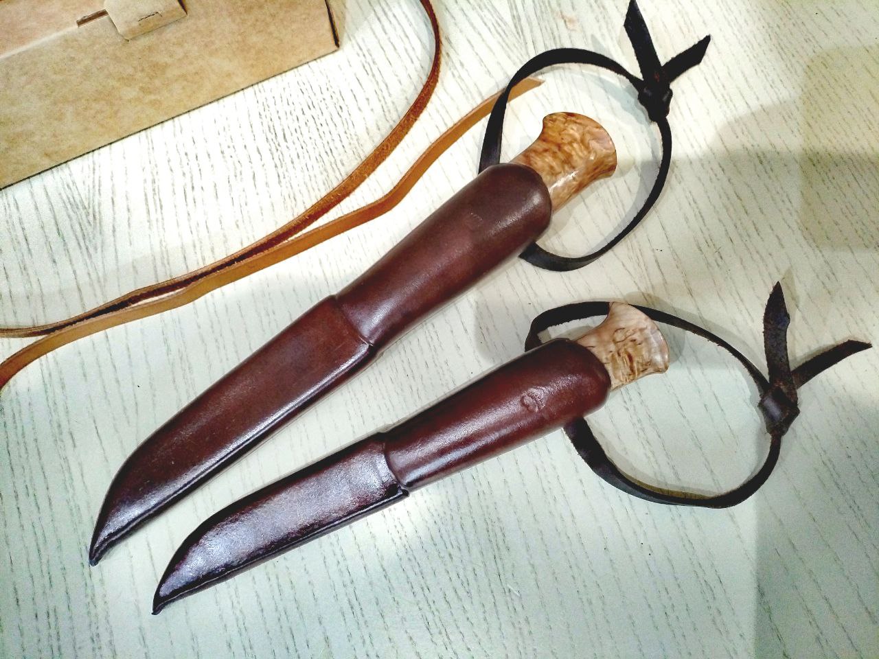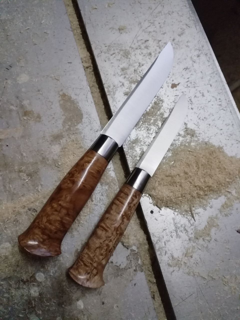 Клинки кованные от Николая Елезова (Архангельская обл) из Х12МФ, 140/137/130 длины клинков, рукояти карелка, ножны с вкладышем из кедра