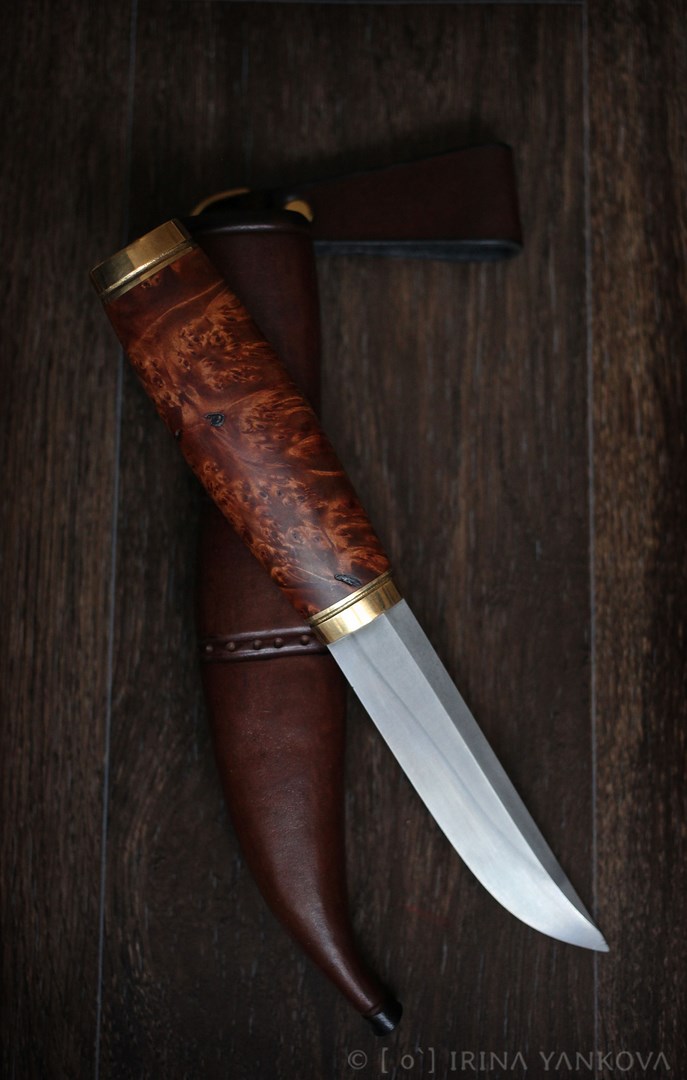 Клинок VK с выравниванием спусков и корекцией геометрии на алмазных брусках врукопашную ,протравка для подчеркивания линии закалки и минимальной защиты -120/25/5мм.Руокять латунь ,ивовый кап естественной сушки,тунговое масло,расклёп - 120/35/22мм.Ножны кожа крс ,фанерный вкладыш.