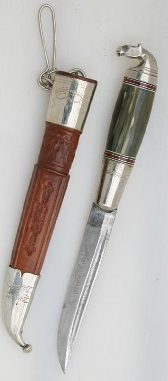 Мои скромные познания подсказывают, что это конный пукко от iisakki järvenpää, устье ножен в металлической окантовке редкая вещь, характерная.
