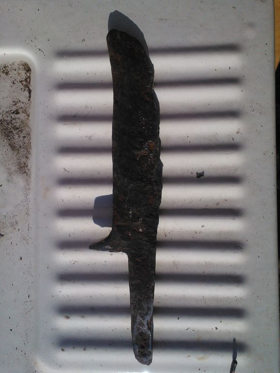 Мне в руки попал старый клинок от ножа, весь старый, ржавый. Длинна клинка примерно 15-18 см, хвостовик см 7-8, ширина клинка примерно 3,5 см, толщина по обуху примерно 8 мм. Ржа его, конечно, очень поела, но живой толщины мм 3 в самом ржавом месте есть. Если кому интересно заняться садомазо с этим клинком, отдам в хорошие руки. Единственная просьба: показать конечный результат. В воскресенье, понедельник буду в Петрозаводске, пишите или в личку или тут. В субботу ответить не смогу.