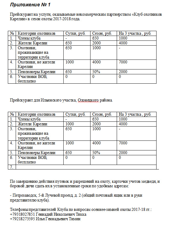 Прейскурант на услуги, оказываемые некоммерческим партнерством «Клуб охотников Карелии» в сезон охоты 2017-2018 года.