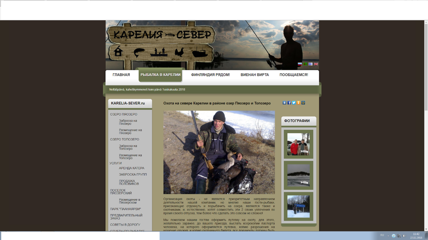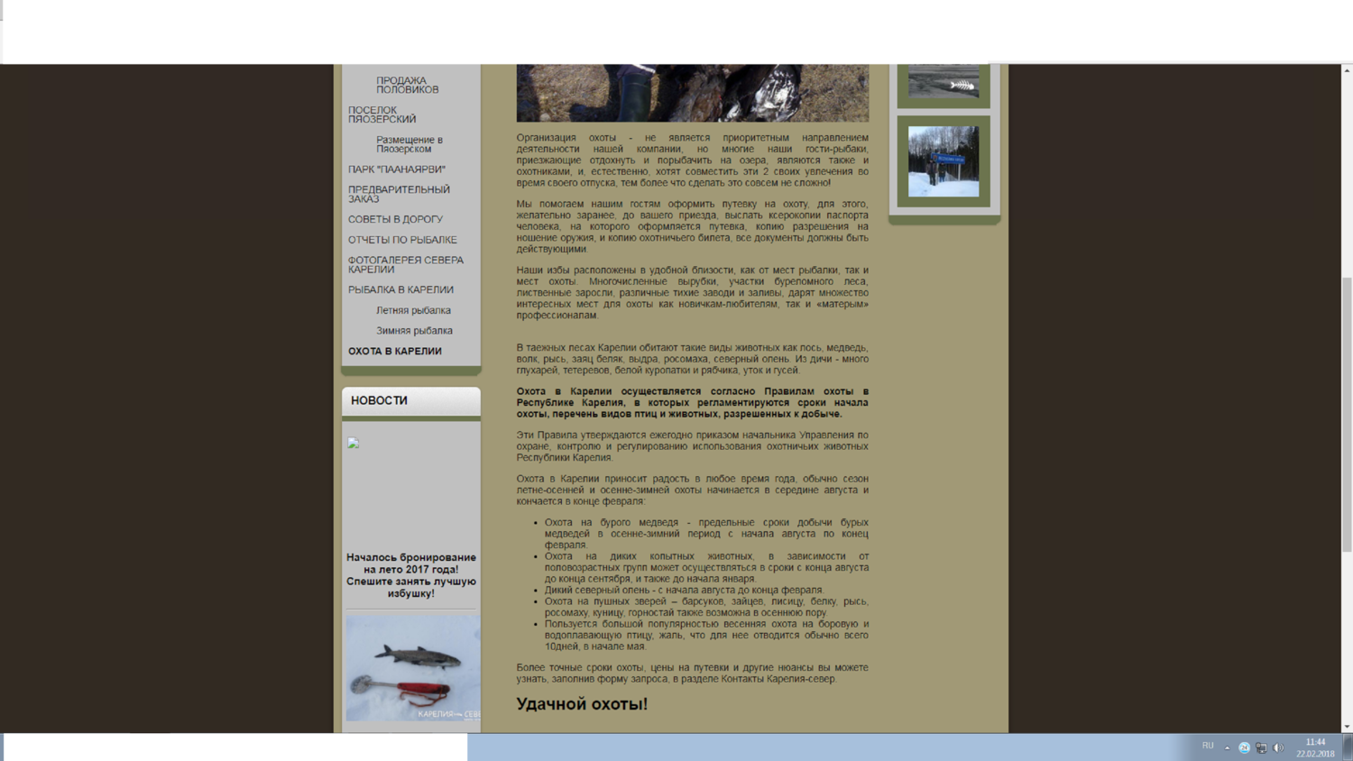 Охота в Карелии приносит радость в любое время года, обычно сезон летне-осенней и осенне-зимней охоты начинается в середине августа и кончается в конце февраля: