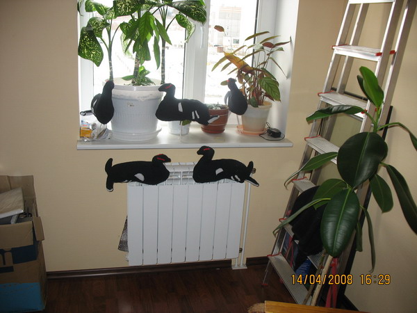 У меня все также. Выкройку сам разрабатывал. Вроде бы получилось нормально. Осенью одно чучело тетеревятник утащил!kosach писал(а):А чучела у меня самодельные (3 штуки)- сами шили.