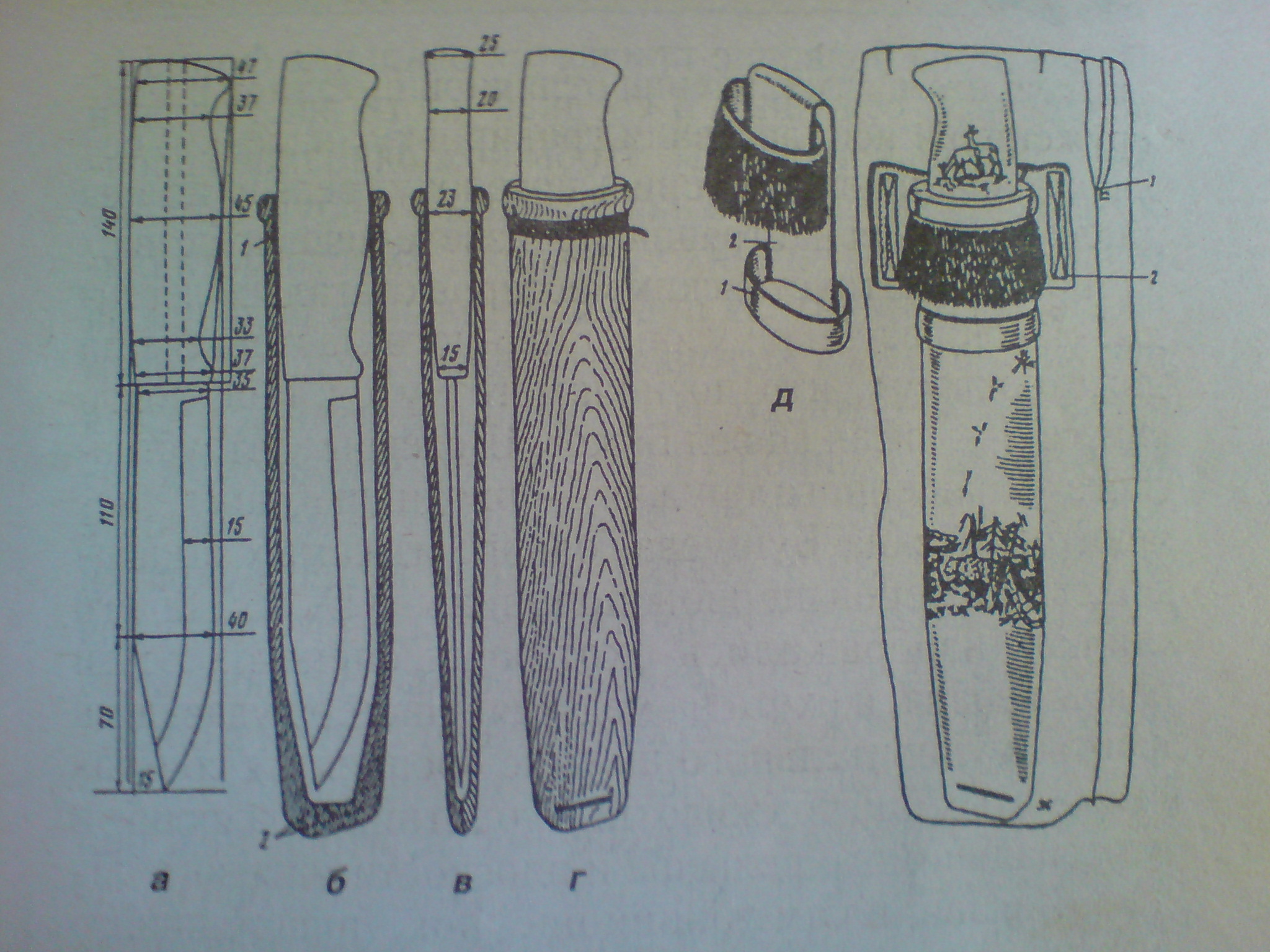 На широкой стороне ножен можно выжечь красивый рисунок или узор. Древесину пропитывают в кипящей олифе. Крепление к ножнам из двух плотно надевающихся на ножны кожаных или камусных колец шириной 3 и 1.5 см, соединеных широким (12 на 4) ремешком.