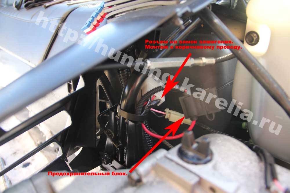 3) Монтируем на провод предохранительный блок. Один выход - к клемме в районе замка зажигания на коричневый провод. К этому проводу подается плюсовое питание, когда ключ в положении "Зажигание включено".
