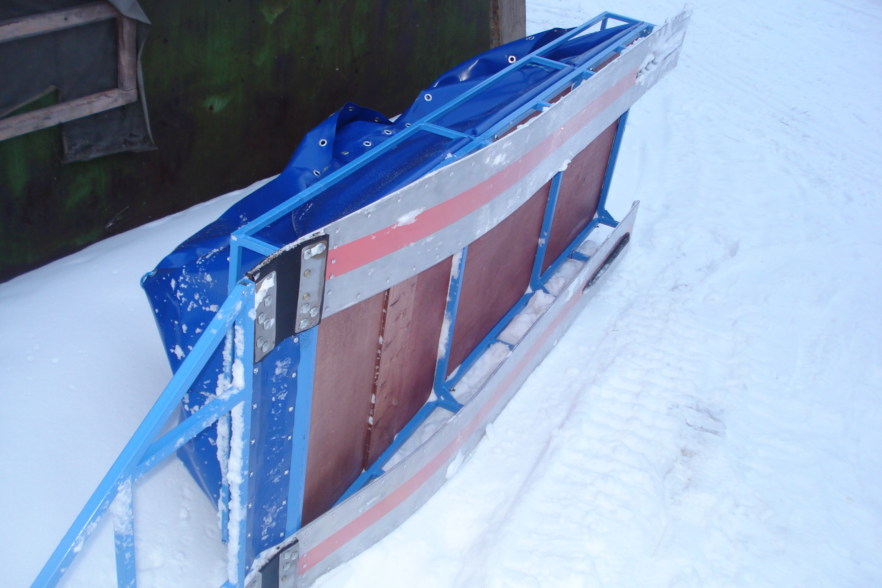 - Полозья снизу подшились 7 мм фанерой и сверху нержавейкой от старых прилавков. Штатный непонятный материал, толи капрон, толи пластик - ободрался за один выезд. Нержавейка загнута по краям. И фанера и неражава подшивались клепками.