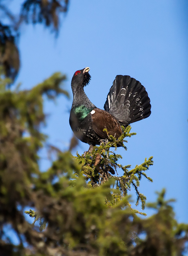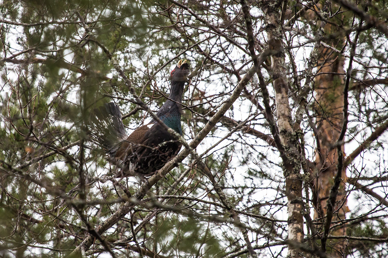Для колорита, так сказать, для реальности токовых ситуаций мой глухарик, что сидел и токовал в достаточно плотной крепи веток примерно в средней зоне дерева по высоте.