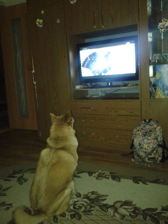 а собачка пока охотится по телевизору,ну уж очень обожает смотреть канал Охота и рыбалка!!