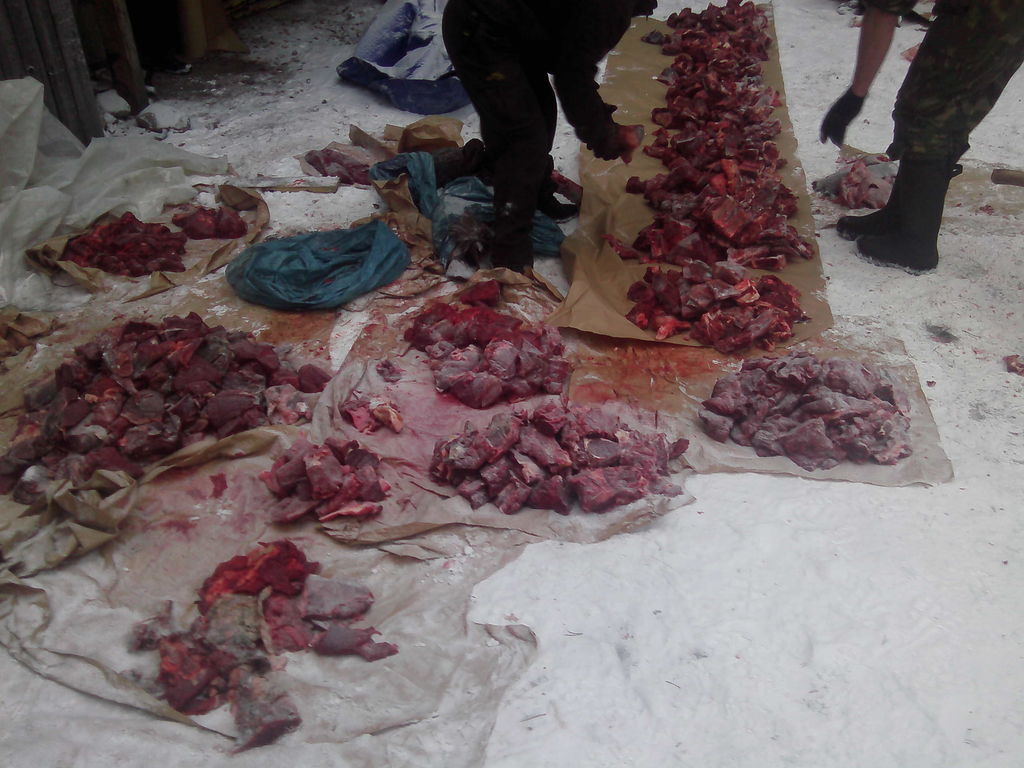 По кучкам не посчитать-стараемся разделывать мясо по категориям(вырезка, на котлеты, на суп и т.п.) чтобы сразу по пакетикам и дома в морозилку в разные ящики. Еще кучка для собак.