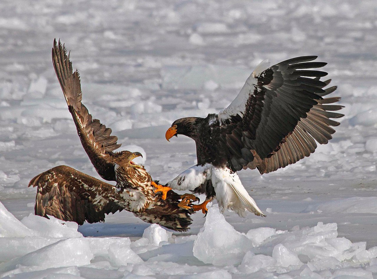 На первом фото: Белоплечий орлан «прессингует» молодого орлана-белохвоста, залив Золотой Рог, Владивосток, зима
