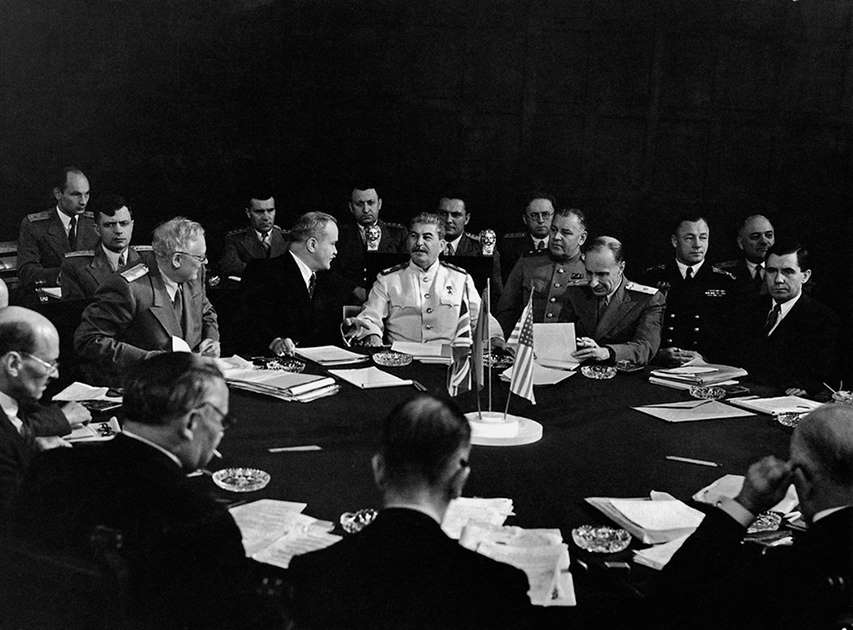 Потсдамская конференция, на которой главы государств антигитлеровской коалиции — Иосиф Сталин, Гарри Трумэн и Уинстон Черчилль — решали вопрос о послевоенном устройстве, распределяли сферы влияния, делили Германию и мир. В центре, в белом кителе, Иосиф Сталин, слева от него — дипломат Андрей Вышинский и министр иностранных дел СССР Вячеслав Молотов.