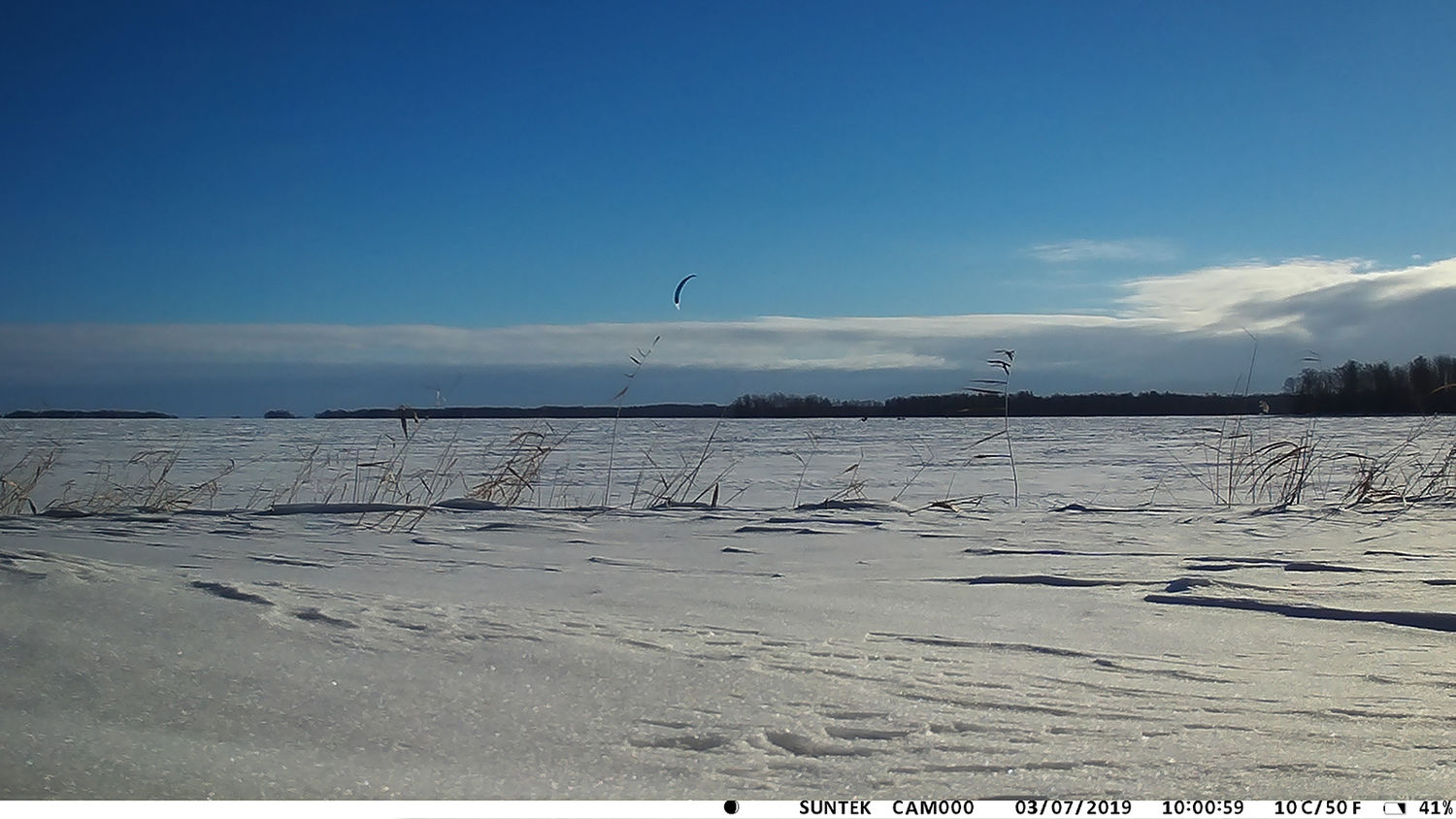В результате, только одна камера не поймала совсем ничего, кроме метели и снежной пурги – эта та самая камера, что была установлена на экскурсионной «Охотничьей тропе» на охотничьем лабазе. А вот три другие камеры поймали – зайцев, лисичку и проезжающих по льду озера гонщиков на кайтах.