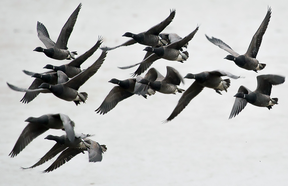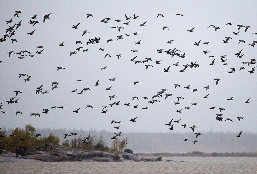 Черная казарка. Формирование стаи, учебное выстраивание клина перед дальним перелетом.