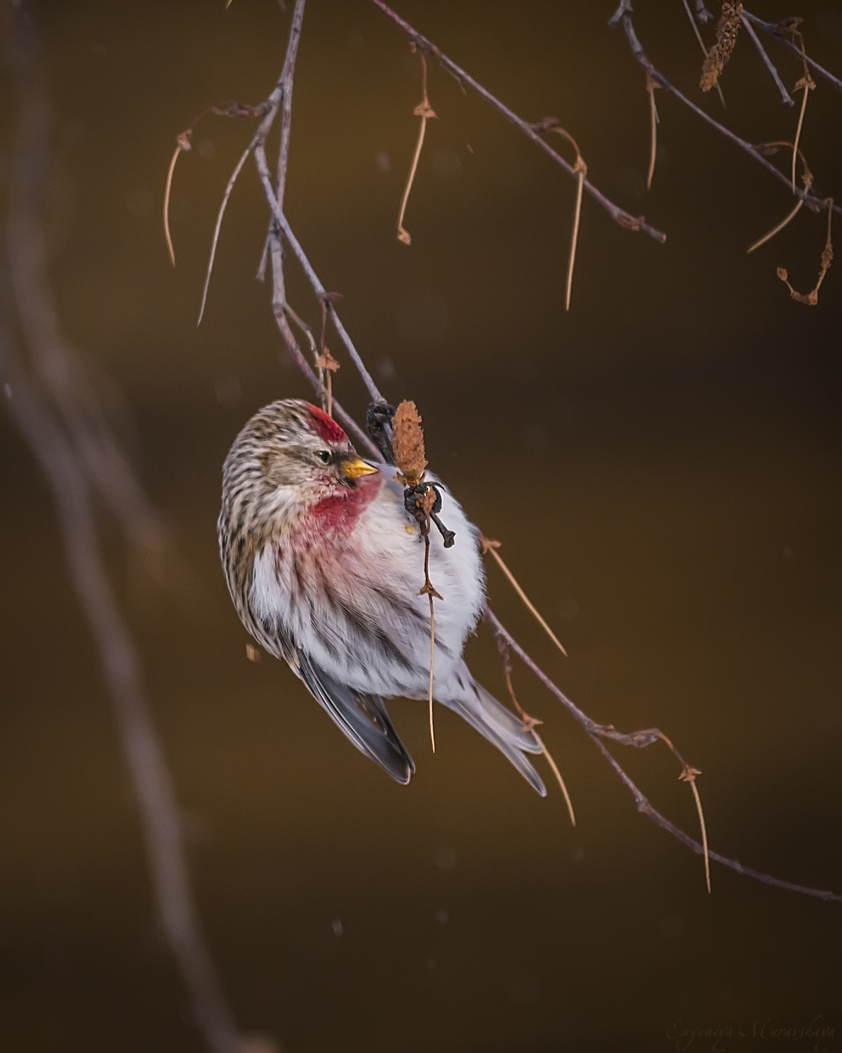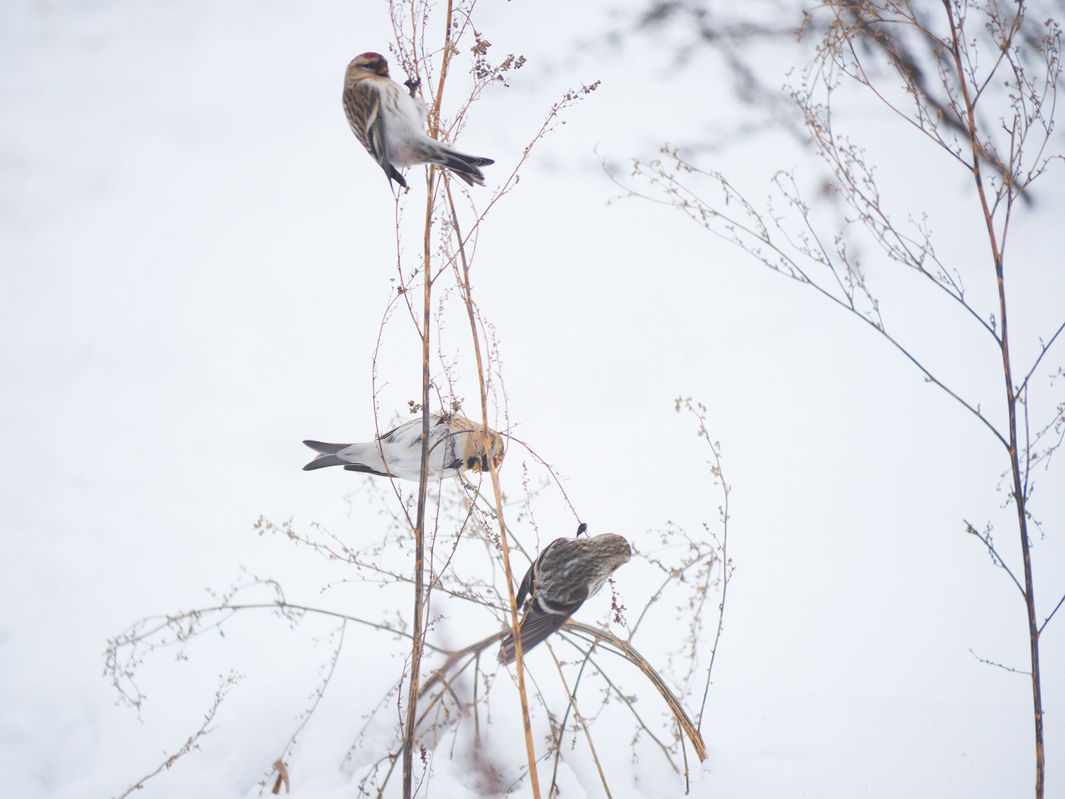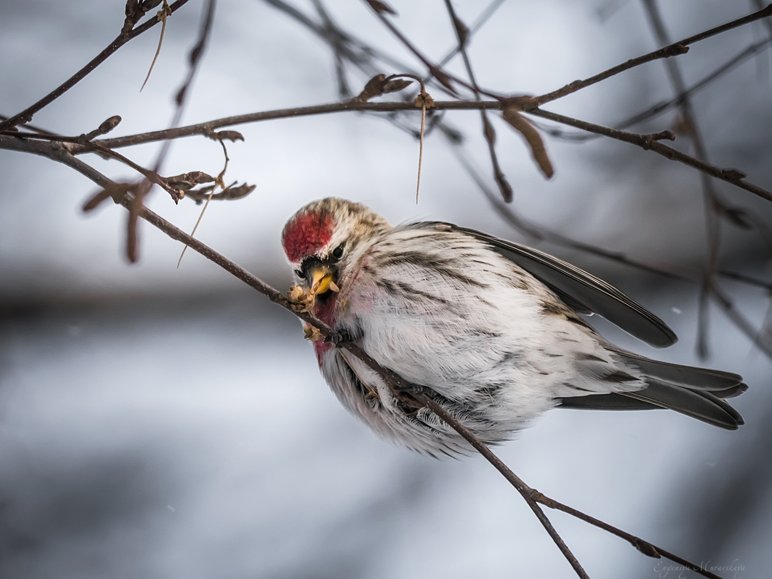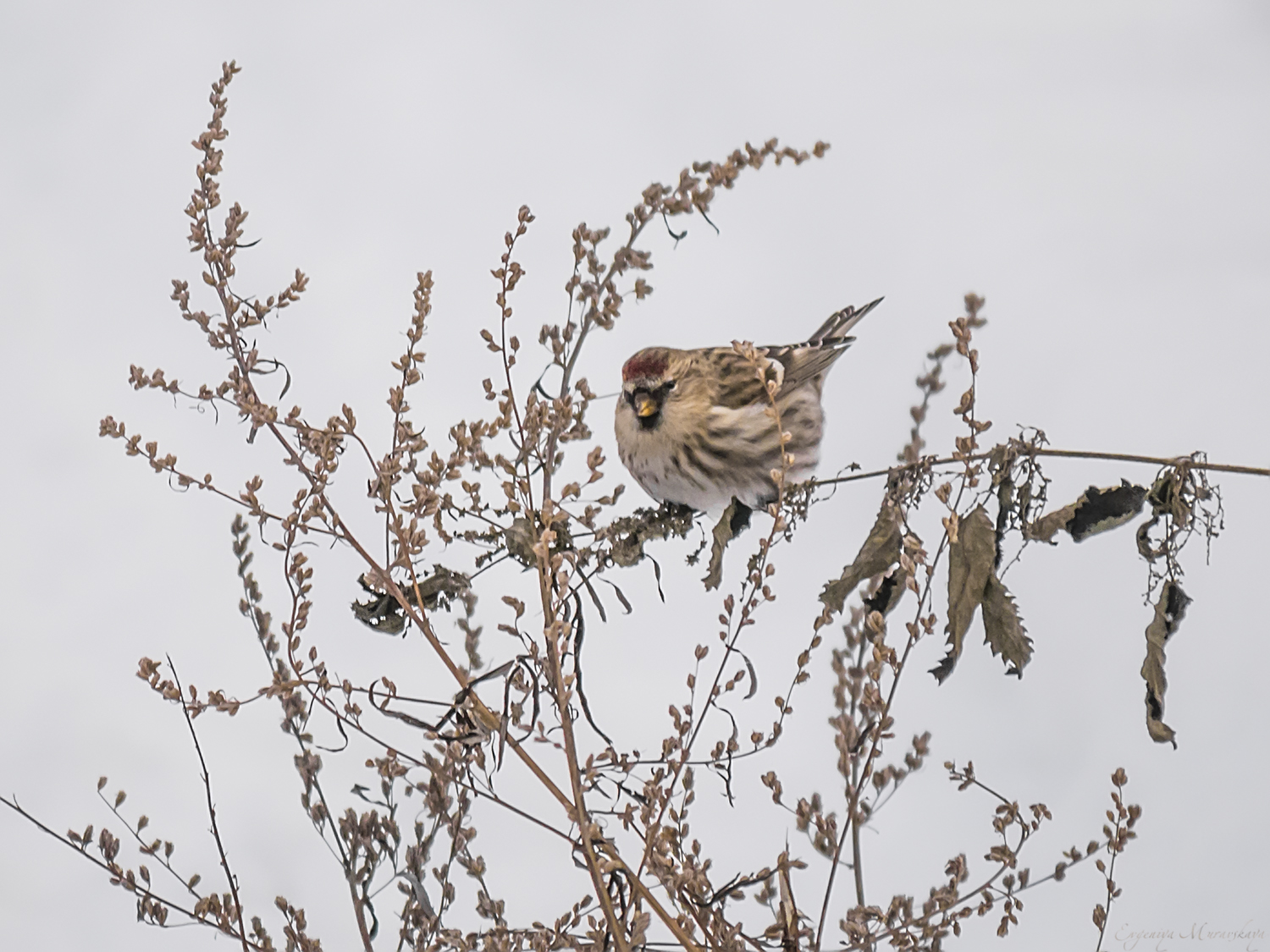 Часто встречаются этой зимой чечётки, но как правило, кормятся высоко в кроне, и на фотографии на фоне неба только попы видны. Чтобы угол съёмки немного поменять, приходиться отходить от дерева, а это приводит к недостатку ФР объектива.