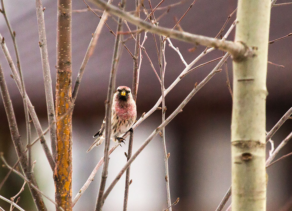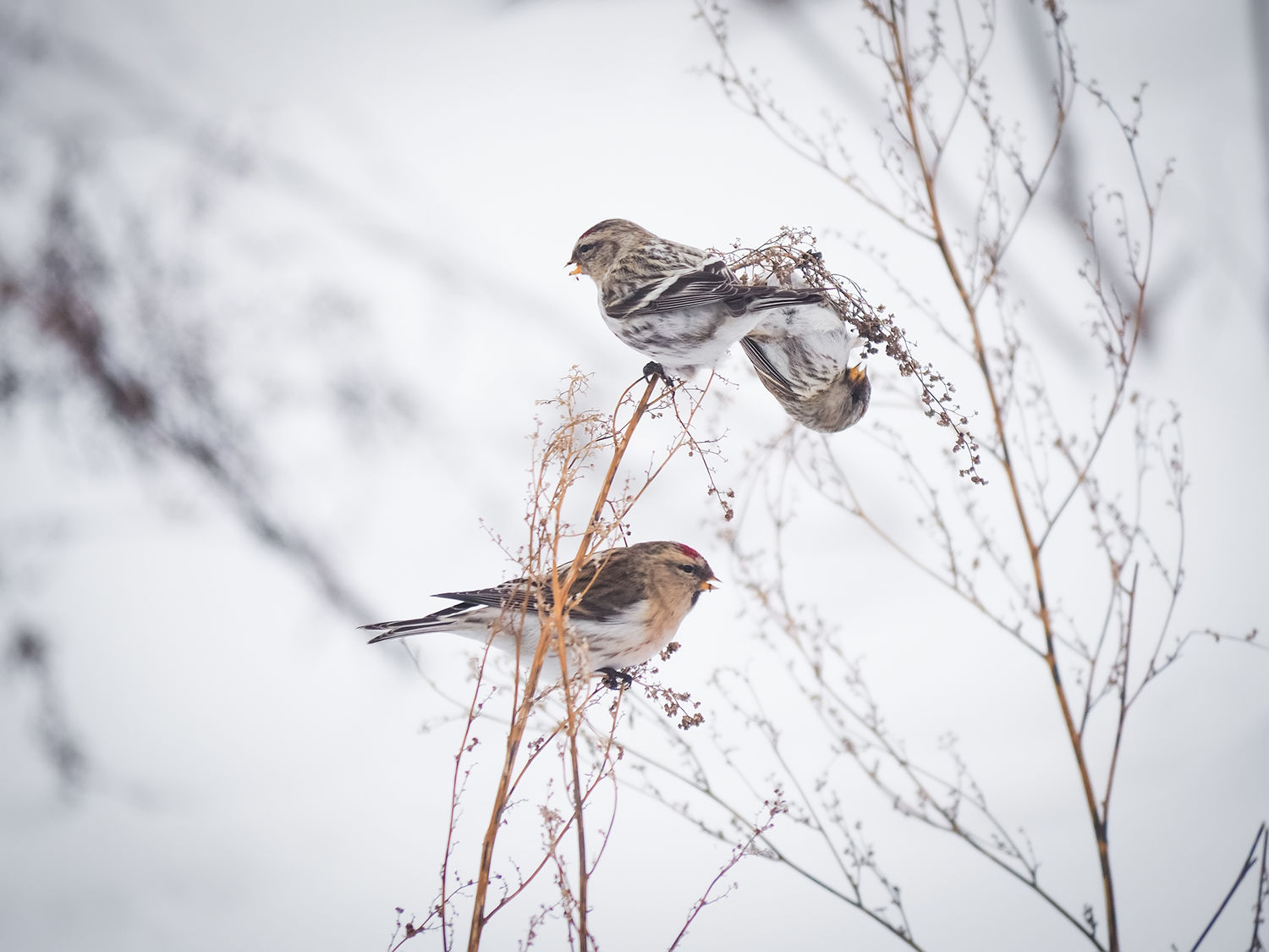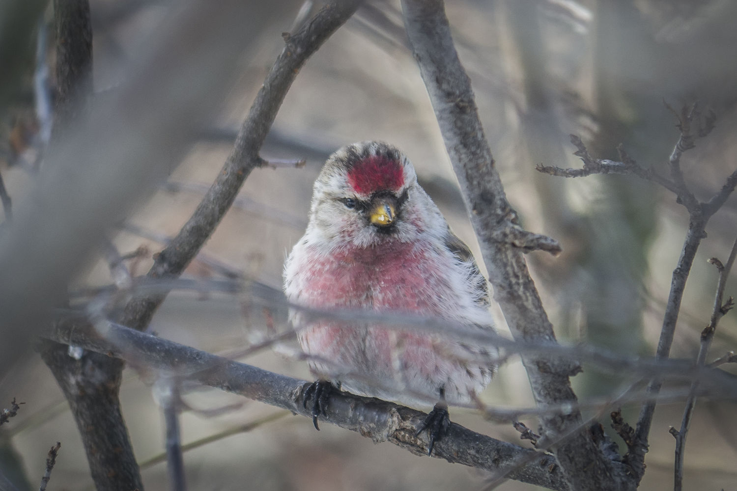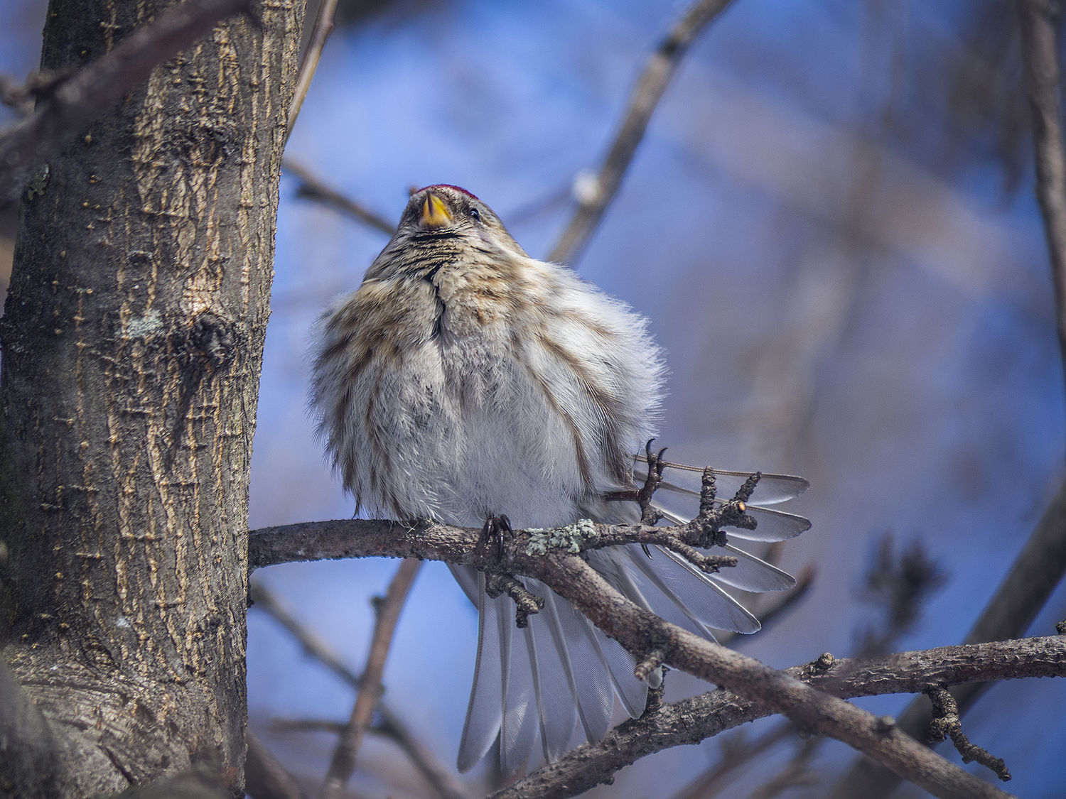 Часто встречаются этой зимой чечётки, но как правило, кормятся высоко в кроне, и на фотографии на фоне неба только попы видны. Чтобы угол съёмки немного поменять, приходиться отходить от дерева, а это приводит к недостатку ФР объектива.
