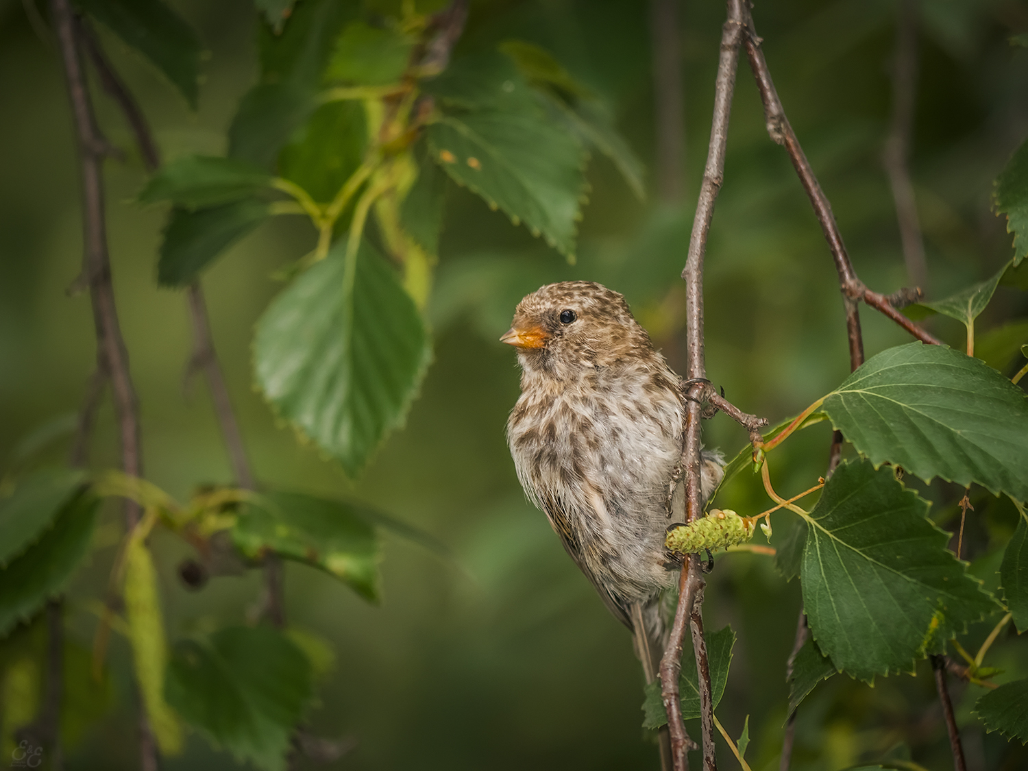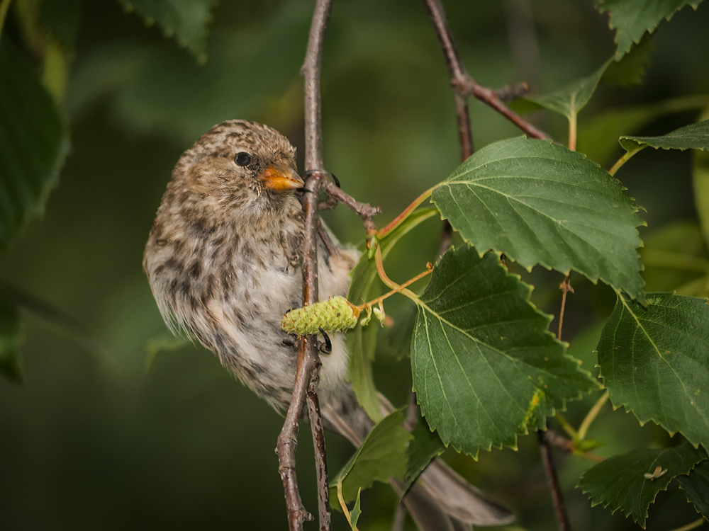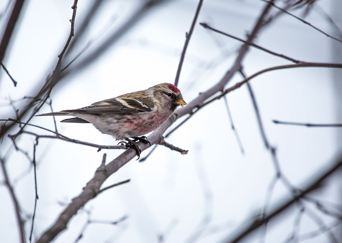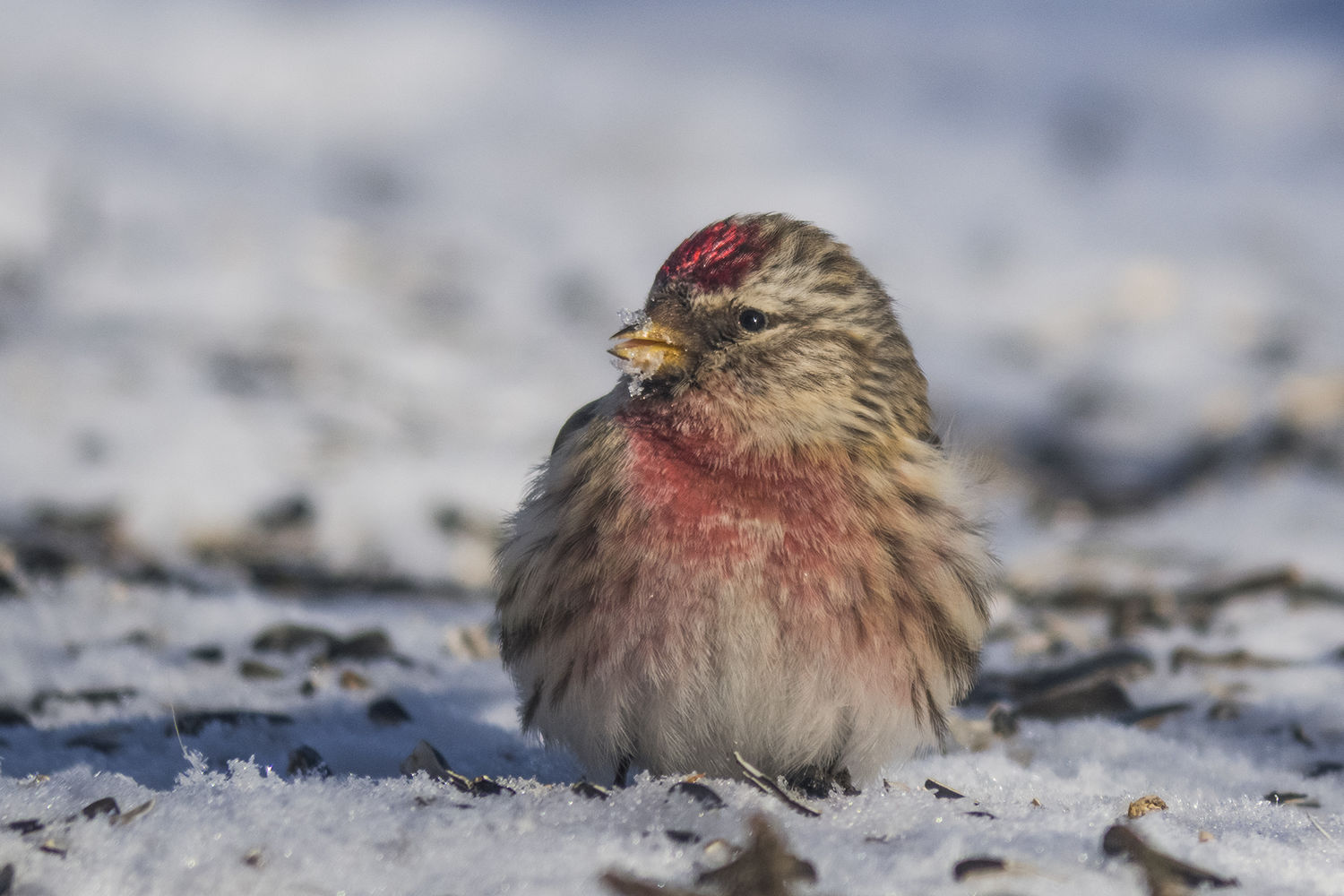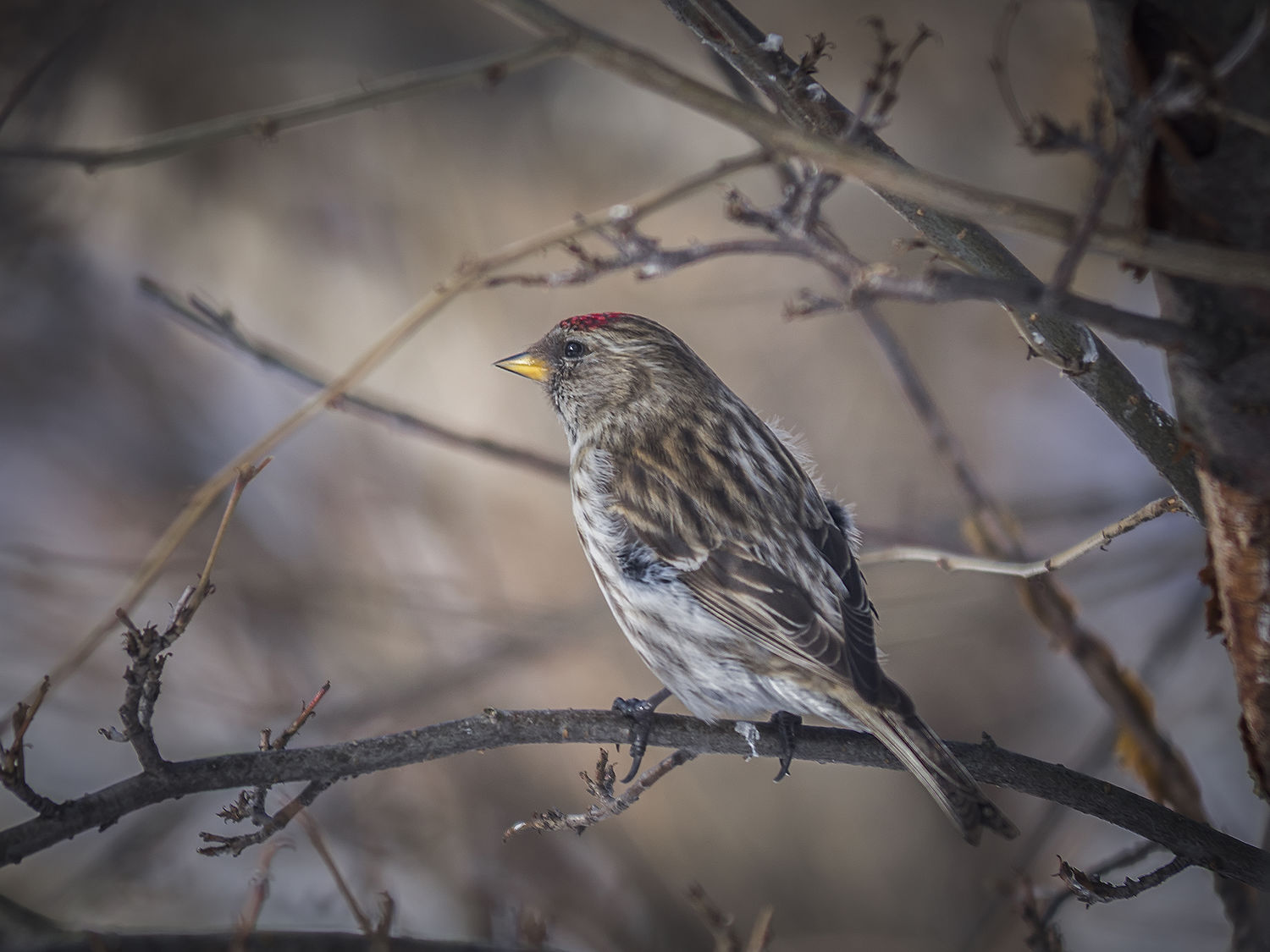Часто встречаются этой зимой чечётки, но как правило, кормятся высоко в кроне, и на фотографии на фоне неба только попы видны. Чтобы угол съёмки немного поменять, приходиться отходить от дерева, а это приводит к недостатку ФР объектива.