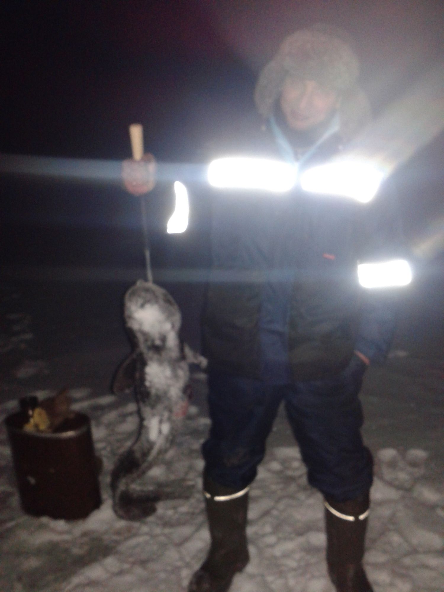 спасибо товарищу с багром ,без него в лунку на 130 не вытащить было бы.адреналинчик.погодка супер без ветра и луна.