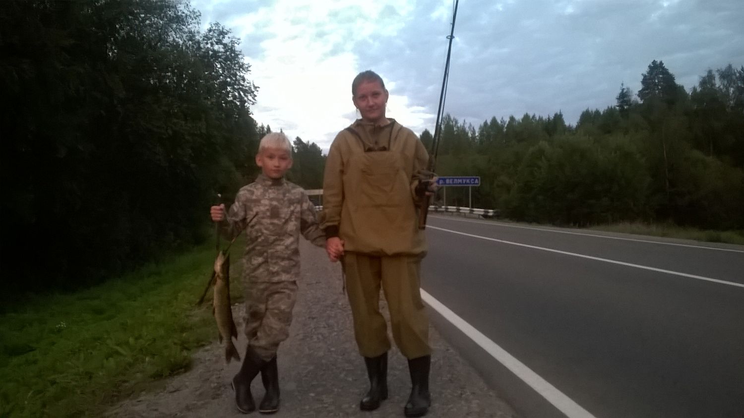 Отпуск подходит к завершению.Сегодня при подъезде к г.Пудожу в реке Велмукса была поймана щучка.Жена и сын очень рады.