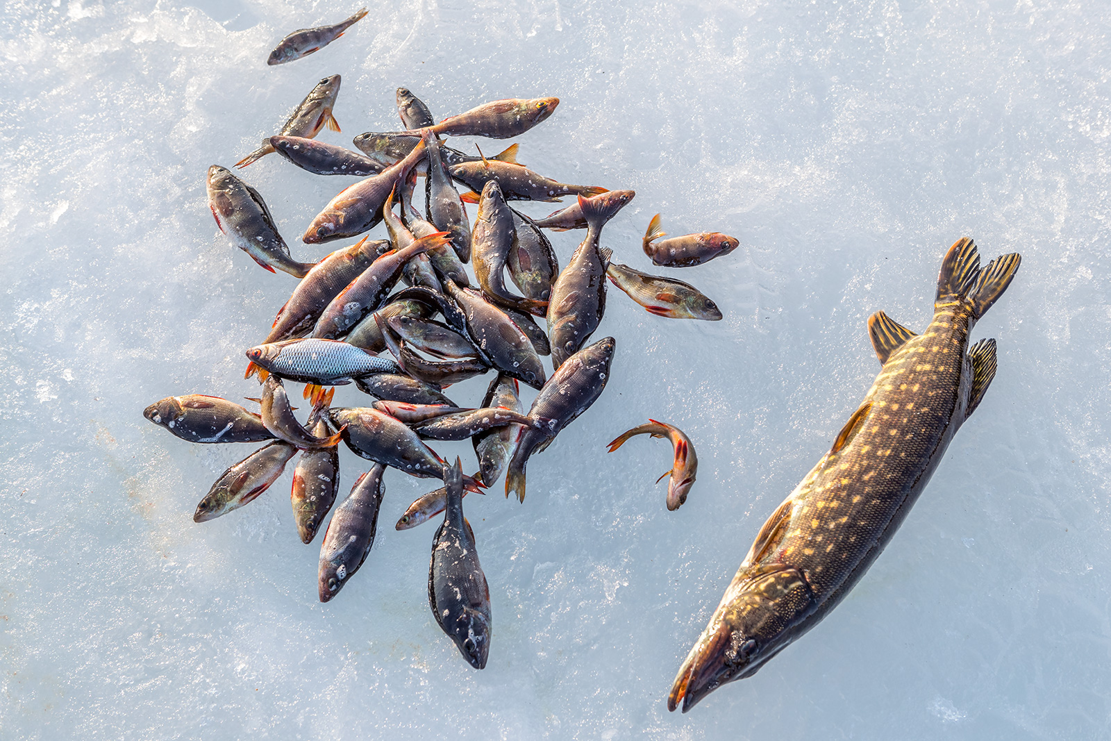 мужик на льду лежит, подъехали, он руку в лунку запихал в пасть щуке она пасть захлопнула и ни туда и ни сюда,
