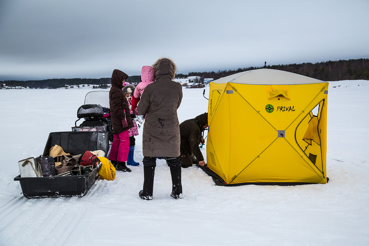 вернулись к первоначальному месту и решили - нет рыбы - будет отдыхать. Поставили палатку. Устроили пикник. Погоняли на снегоходе, на санках... А рыба так и не пришла.