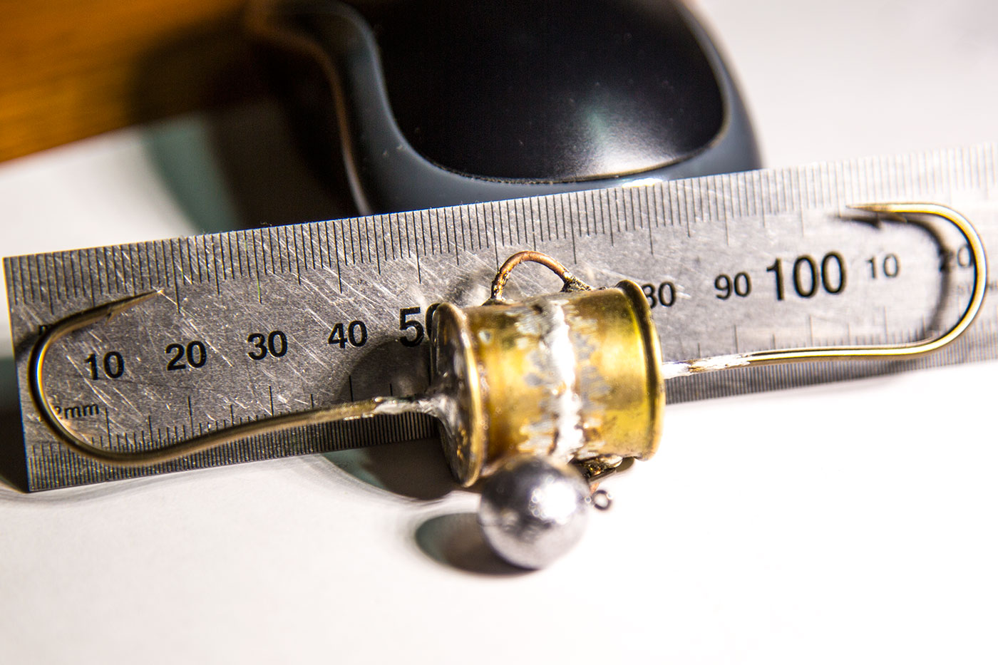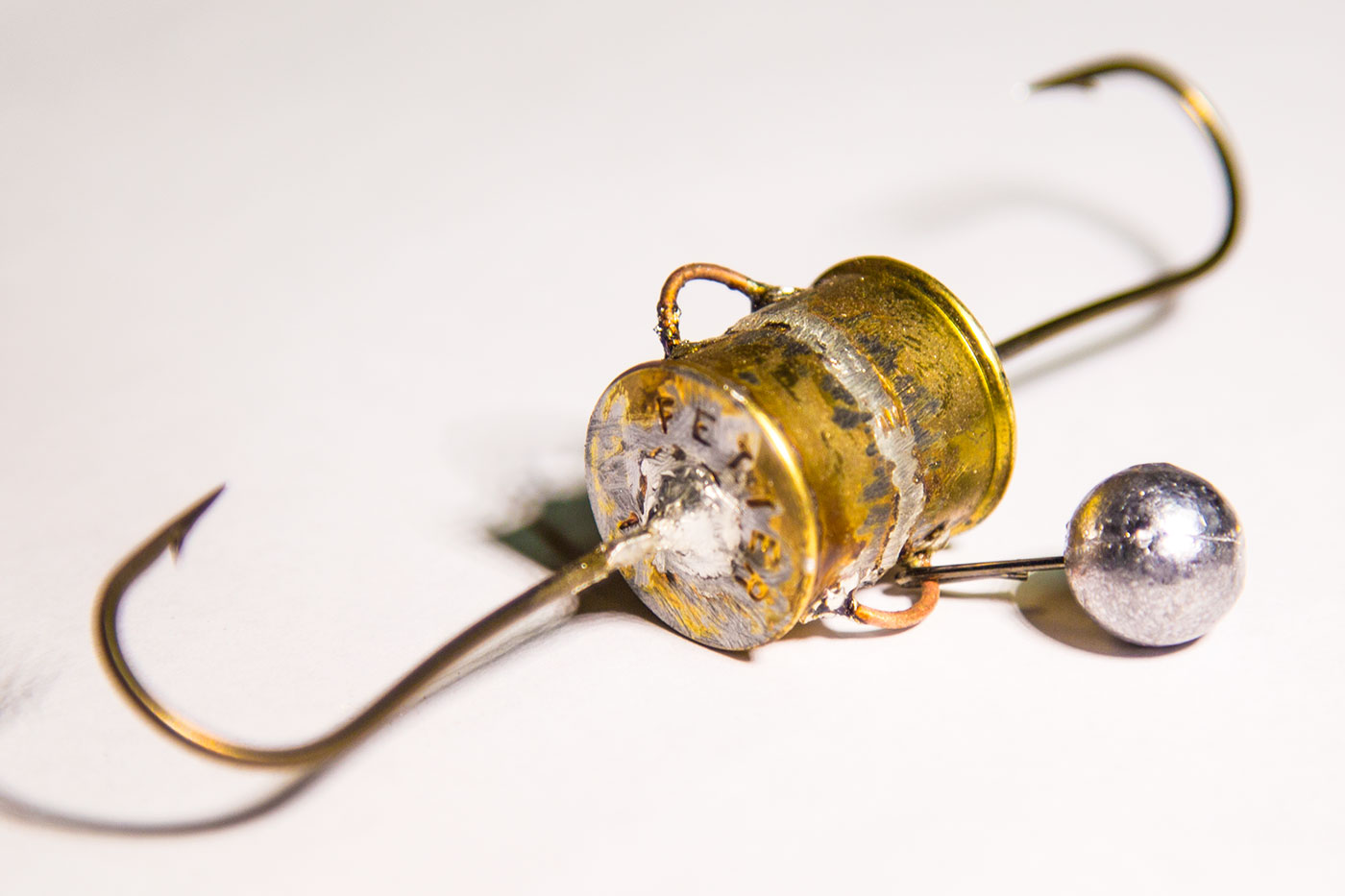 Версия 2. Вторая быстрее спаялась. Крючки больше. Внутри полая - без свинца (только для запайки крючков). Внутри три шарика от мелкого подшипника. Снизу петля для прицепного грузика.