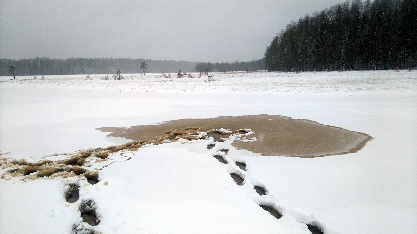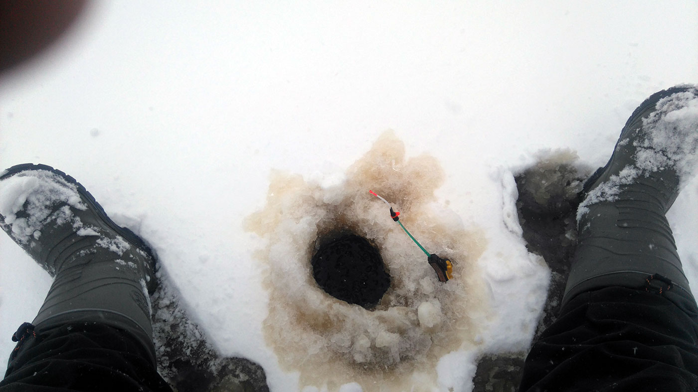Условия на льду не простые. Много сырого снега, под которым скользкий и сырой лед. Лунки предыдущих дней размывает и давит через них воду. Лед не толще 10 см.