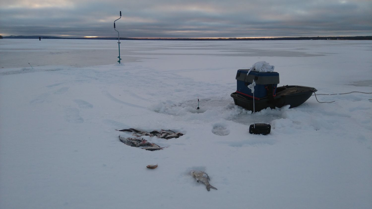 Ответ пришел почти мгновенно: "Едем". Через час мы уже были на озере. В Кондопожской губе - в районе деревни Янишполе. Каждый рыбак побежал в свою сторону - к любимым лункам. Кроме нас первые полчаса на озере никого не было, но народ начал подтягиваться.