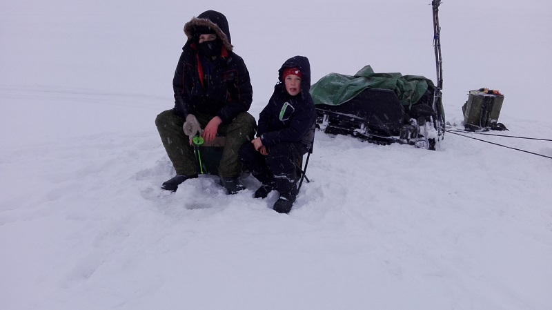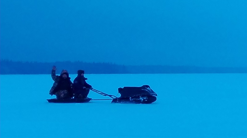 Решил вернутся чуть дальше чем начинали, Шурик доставив меня умчался за остальными, с км. примерно ускакали. Пробурил всему семейству лунки, запустил уду с блесенкой, взял удильник с козявкой, телефон - Па, тут веревка в стартере выскочила- Букс пассажирами метрах в трехстах, и техпомощь спешит на помощь.