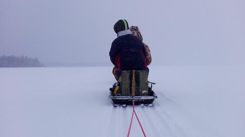 Вот и озеро, собачка снаряжена, пассажиры согласно купленных билетов, лоцман на баке, и берем курс на рыбу. Хотел ехать налево, но техника и снежок внесли свои коррективы. Мотопесик на шесть кобылок усю банду по снежку тащить тащит, но уж жалко животинку, поехали направо- по накатанной тропе за основной кучей коллег по выходнымдоманесидетелей.