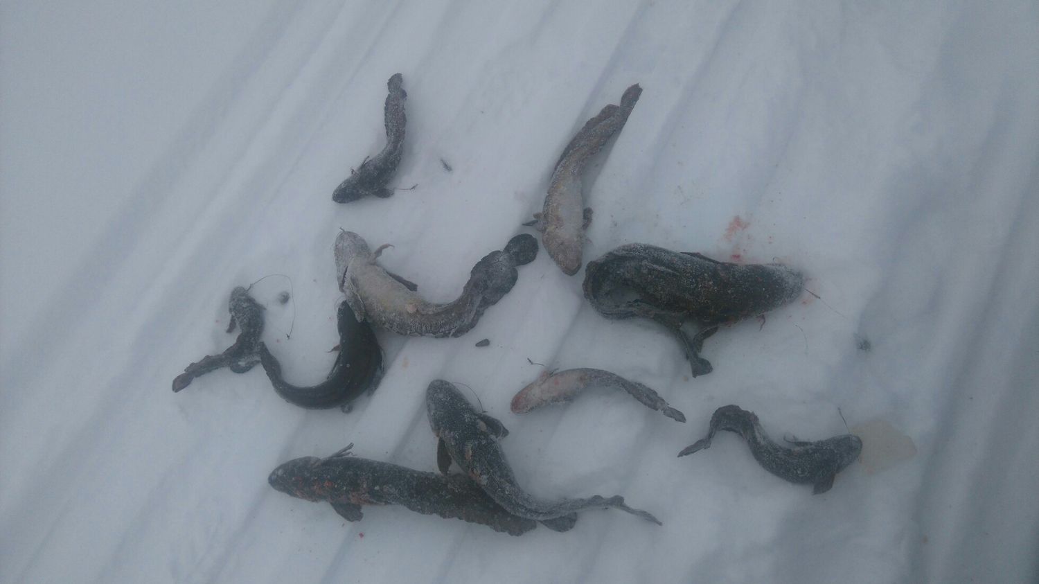 В первый день поставил 10 самоловок. На утро не было сработавших флажков. Оставил стоять дальше. И добавил еще около 10 штук. На второе утро - добыто 10 налимов. Три "пожеванных", плюс один сход при вытаскивании. Также дома обнаружилось, что один крупный налим - съел более мелкого, который уже сидел на крючке. Вот такая неудача и жадность на двоих.