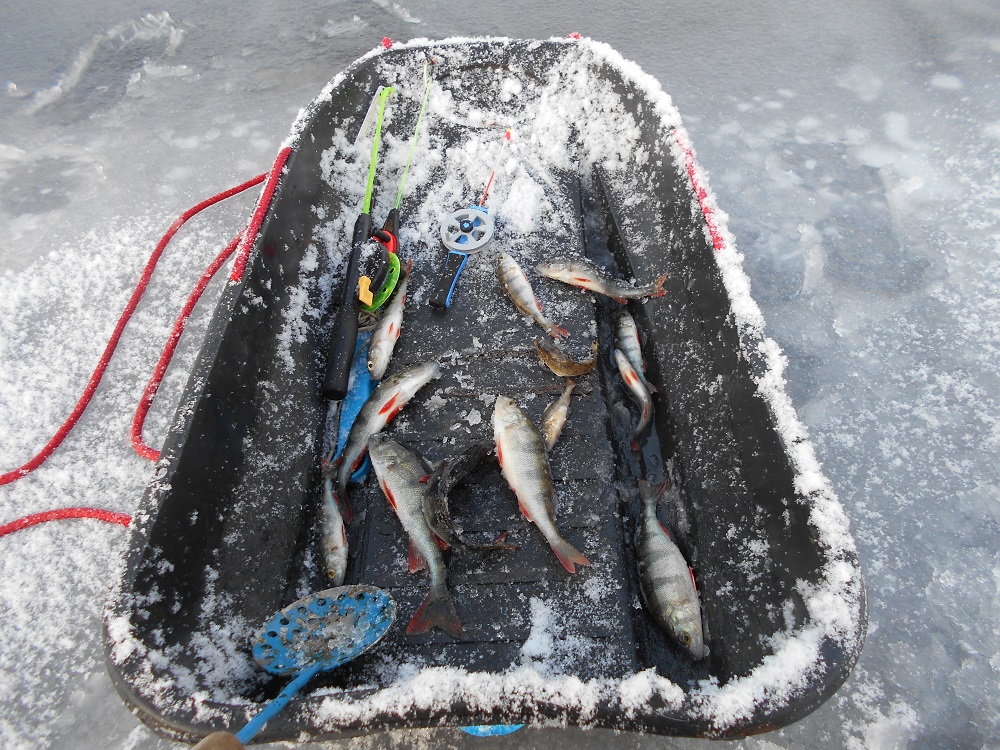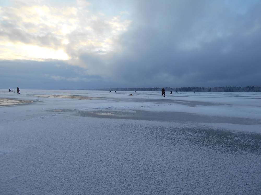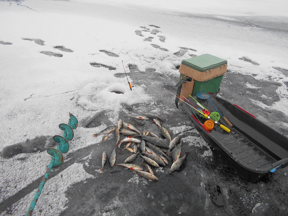 По хорошему надо было бы дома остаться, есть чем заняться, да по магазинам супруга просила прокатиться. Но, все же решил с младшим сгонять порыбалить, да вот сынуля в последний момент отказался. Разум советовал остаться дома и заняться какими домашними делами, таракашки скребли макушку- забей, поехали на рыбалку. Але, совесть, ты где? Может стоит дома остаться? Супруга, грустно вздохнув, сдалась без сопротивление и, получив согласование, совесть успокоилась, клятвенно заверив половинку, что к четырем таракашки доставят рыбачка до дому. Поеду один. Или не поеду. Или поеду. Или… Хотелось сгонять в Заонежье, прикормить ямку одну, посидеть на плотве и «фанерках», зарядить самоловки. Да вот к четырем дома надо быть по любому, потому как в гости, блин, надо идти. Прикинул, рыбачить можно будет максимум часов до двух, а потом собирать манатки и рулить домой. Будильник на шесть, второй на семь, если по запасному варианту, поближе можно поискать онежского окушка. В шесть утра, загасив первый будильник подумал, что по первому варианту лучше ехать на полный день, потому можно покемарить еще часок. И до семи еще поворочался к кровати, каждые пять минут поглядывая на часы. Организм хотел спать, остатки разумного отчаянно пытались отговорить от поездки, тараканы гнули свою линию, совесть спала. К половине девятого приехал на озеро. Опять дилемма. Куда пойти, куда податься? Пойти налево или прямо шагать. Благо по любому чапать не далеко, около километра. Решил идти прямо. Получилось чапать по чаче, образовавшейся после последнего снегопада и оттепели, благо хоть не глубокой, местами насквозь сырая снежная чача, местами вода на льду и скользко как на мыльном кафеле. Пробурил первую лунку, около пяти метров. Попробуем. Любимая окуневка ложка с подвесом, ничего не принесла, на смену окунул маленькую блесенку- трехсантиметровый «впай». Через пару минут рыбка отозвалась на приманку, однако подцепить не получилось. Несколько безрезультатных поклевок только раззадорили. Не стал откладывать исполнения первого правила блеснильщика в долгий ящик, и запустил в лунку чертика с парой опарышей. Результат не замедлил сказаться. На свет появился первый окушок суповичек, следом пара ершей и еще один матросик. Ну что ж, рыбка какая никакая есть, пойдем дальше в поисках рыбацкой удачи и чего ни будь посущественнее. Перешел еще немного подале и пробурился на семи метрах. Схема прежняя: любимая окуневка, мелкий впай, чертик. На сразу, но начало поклевывать, так же большую блесну полностью игнорировали, на мелкую не зацеплялось, чертик поставлял в санки полосатых ухейных рыбок. Но ничто не вечно под луной, и под облаками январского хмурого дня, а клев вообще штука непредсказуемая. Часа через пол клевать перестало. Покружил, побурил, помакал приманки. Ничего. Народ тоже не видно, чтоб активно руками махал. Надо менять место. Направил стопы куда с утра хотел идти, там от береговой перепад глубин более крутой, не свалы, но… В ту же сторону еще рыбачек отправился, вместе и пошли. У мужика в активе к тому времени, а время уж к полудню приближалось, насчитывалось пара ершей и пара суповичков. У меня в санках с десяток окушков и штук шесть ершей, на ушицу уже хватило. И еще с десяток прозрачных будущих «горбачей» были утоплены обратно, набирать размер. А дальше поиск окуня на разных глуб