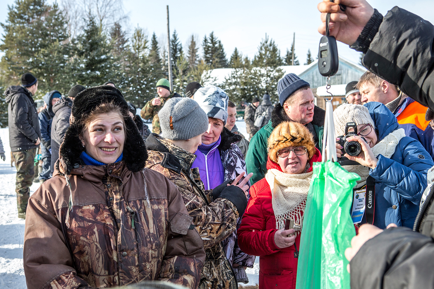 Когда время для состязания по рыбалке закончилось - на берегу кроме судейской работы по замерам улова - была готова жаркая уха и большой котел с горячей кашей для всех проголодавшихся рыбаков и замерших болельщиков. Как только судьи и организаторы откладывали микрофон - инициативу на себя брал фольклорный коллектив «Сударушка» из поселка Красноборский Пудожского района Карелии - живой концерт на морозном берегу пускал в пляс всех, кто сдал свой улов и отведал угощений.