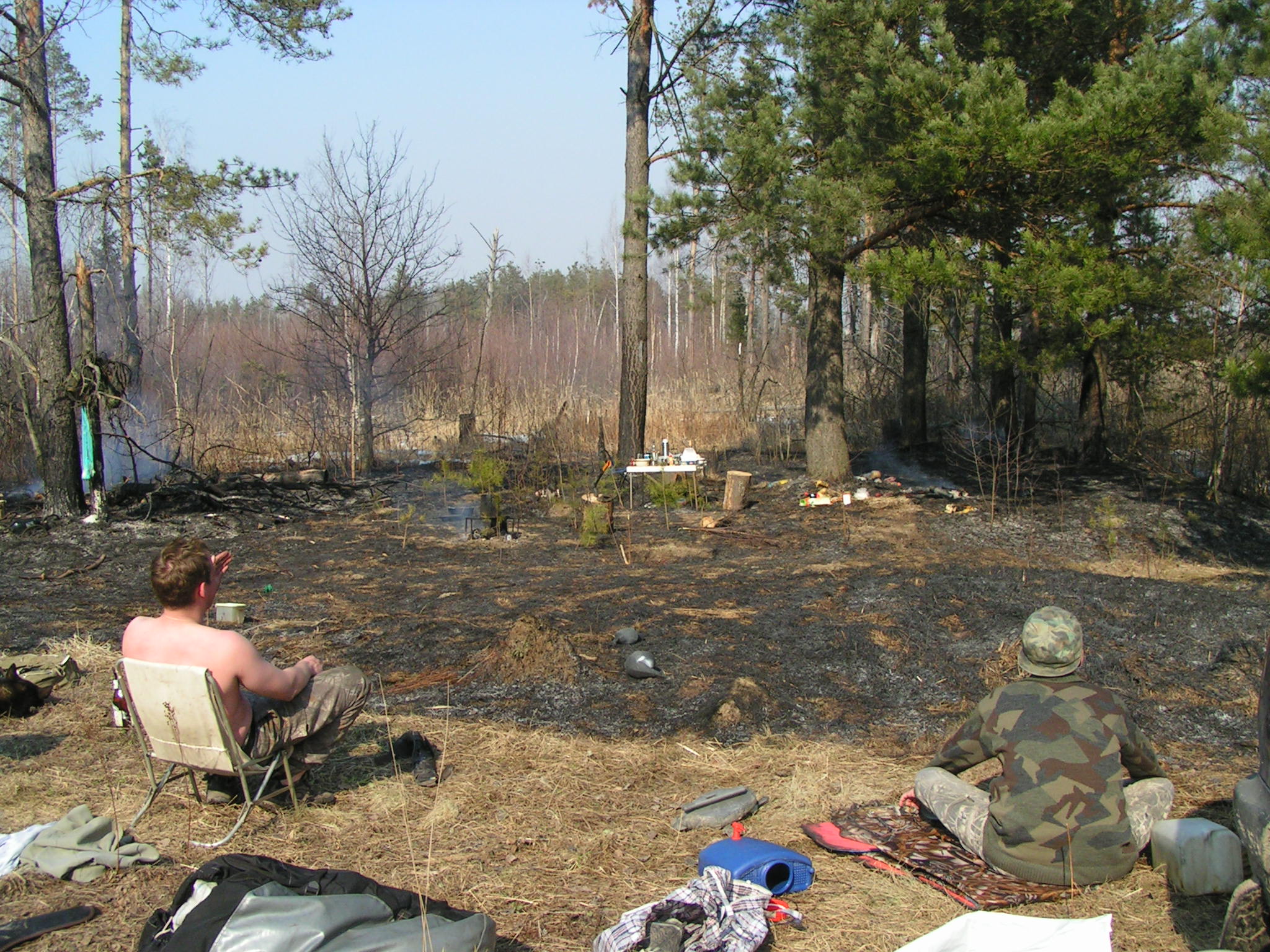 Вчера вернулся с границы Московской, Рязанской и Владимирской области. Гусь идет, но где-то в стороне, утка есть,вальдшнеп есть. Попали в пожар: половина лагеря сгорела (хорошо что не та где стояли машины...). Сейчас побираюсь по друзьям в поисках снаряги (начиная от пенки/спальника и кончая профилями/чучелами) и во вторник в Тверскую... Вот одна фотка: на этом месте и был собственно лагерь, стояли палатки... Навсегда лично для себя уяснил: ОХОТИТЬСЯ В СТРАСТНУЮ НЕДЕЛЮ НЕ НАДО!..