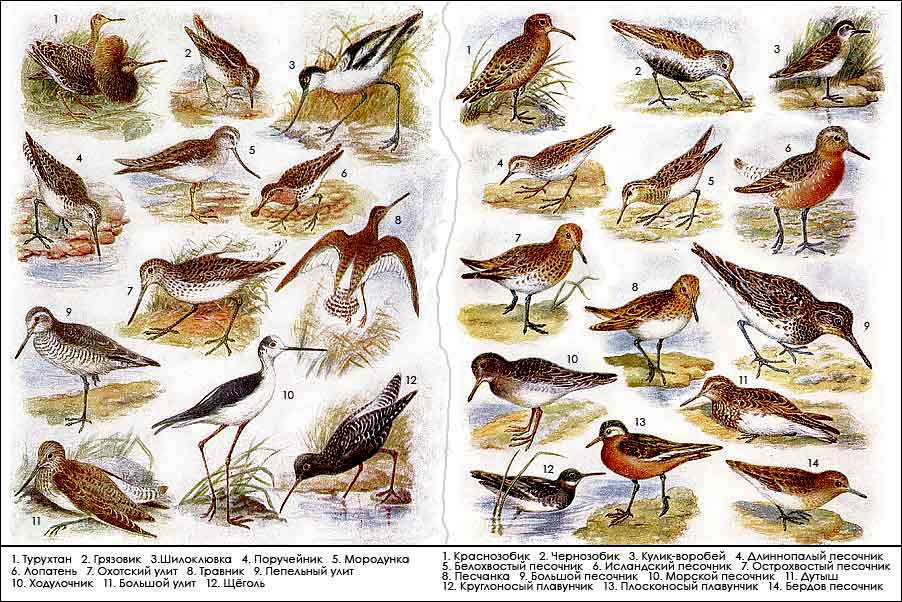 ПЕСОЧНИКИ. Большинство представителей этой обширной группы гнездится в арктических (реже — высокогорных) тундрах; в умеренных зонах страны они встречаются в период весеннего и осеннего пролетов. Песочники —довольно молчаливые кулики. Они обычно крупнее скворца, плотно сложены, короткоклювые и коротконогие, с маленькими глазами, придающими им характерное «подслеповатое» выражение. Обычно во время пролета песочники держатся плотными стайками. Самый крупный из них, большой песочник, несколько напоминает улита, однако сразу бросается в глаза его коротконогость. Общий тон окраски — серый. Исландский песочник мельче. В брачном наряде он окрашен снизу в рыжий цвет. К осени его наряд становится серым и в это время его нетрудно спу тать с большим. Отличия заключаются в следующем: большой песочник размером с галку, сверху пестрый, беловатое надхвостье контрастирует с темно-бурым хвостом. На груди ожерелье из крупных черноватых пятен, заходящих и на бока. Исландский песочник — с дрозда, однотонно серый сверху (надхвостье светлее спины), снизу светло-се-рый, без пятен. Заметны светлые брови. Большой песочник встречается только на крайнем востоке Сибири, исландский гнездится в тундрах Таймыра и некоторых островов Ледовитого океана; на материке встречается редко, на пролете.