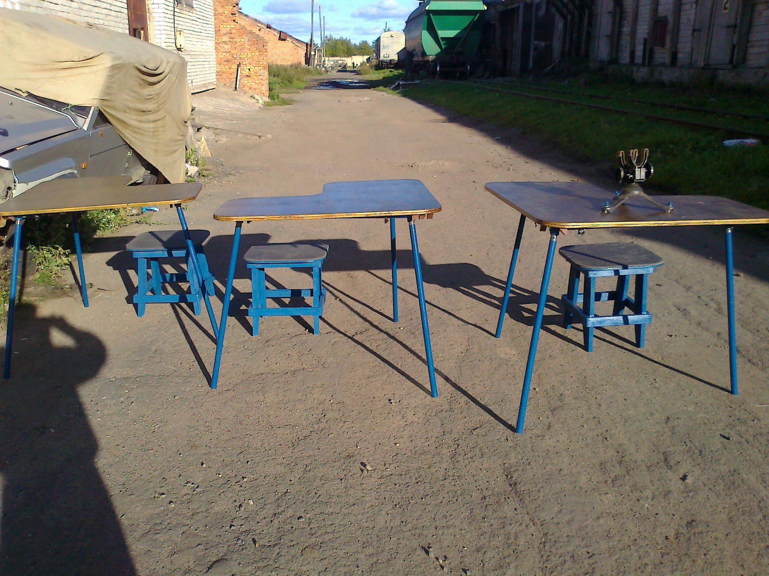 Столы будут выглядеть примерно так, как на фото, тока компактней. Эти я делал для стрелковой секции. Для пневмы нужны поменьше. Ноги откручиваются и в багажник. Еще бы табуреты разборные... По типу, как для пианино, тока ноги складные.