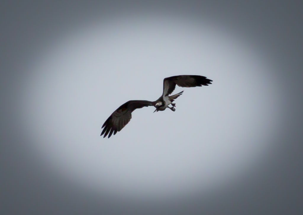 В небе, с противоположной стороны рассвета летает скопа. В лапах явно что-то есть. Сфотографировал. Далеко. Но зато понятно! Это в лапах камбала! Вот хитрунья, рыбакам в сети камбала не идет, а она на отливе отлично ее ловит! А по соседству еще одна скопа, но та еще только высматривает добычу. Поморы говорят, каждое утро при отливе эти птицы здесь наблюдаются.