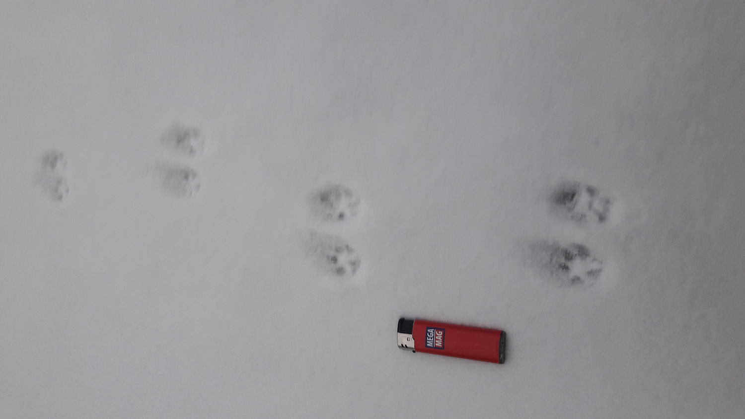 Да и по размеру след на волчий не тянет. Так что, на мой взгляд, это след, либо небольшой собаки, либо лисы. Животное явно передвигалось галопом, с силой отталкиваясь когтями от твёрдого грунта, потому и отпечатки когтей кажутся такими длинными и чёткими. Идущее шагом животное, на таком грунте, следа бы не оставило вовсе. Точно определить, лиса или собака пробежала, на галопе сложно, следы очень похожи, и по размеру, и по форме.